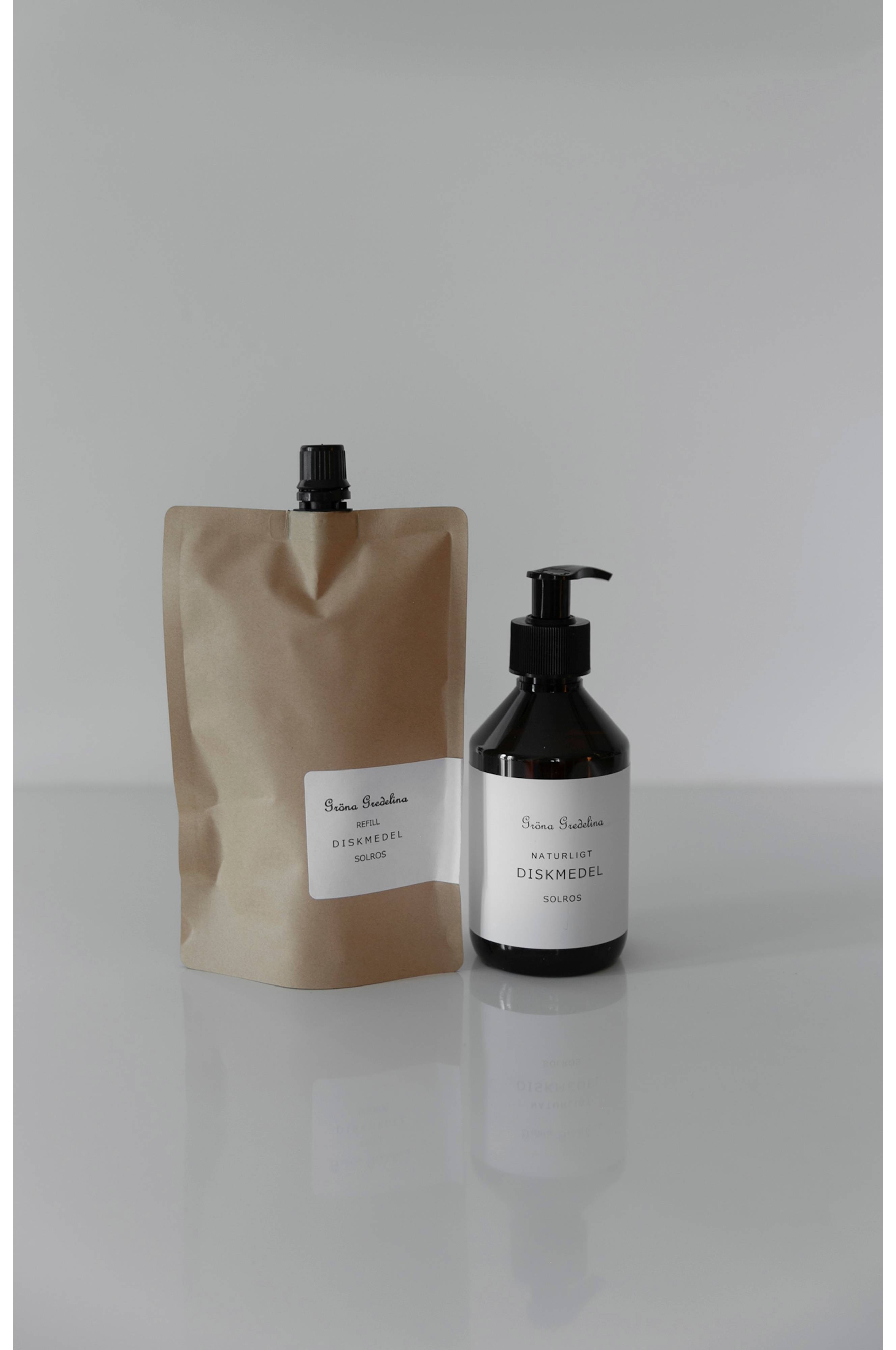 Refill i biologiskt nedbrytbar biobag till Diskmedel solros. Gröna Gredelinas diskmedel passar till all slags handdisk. Både milt och effektivt! Eftersom det är i avsaknad av starka tensider så löddrar inte diskmedlet så mycket som man kanske är van vid. Baserat på solrosolja och därmed en växtbaserad produkt. Påsen sorteras som papper.