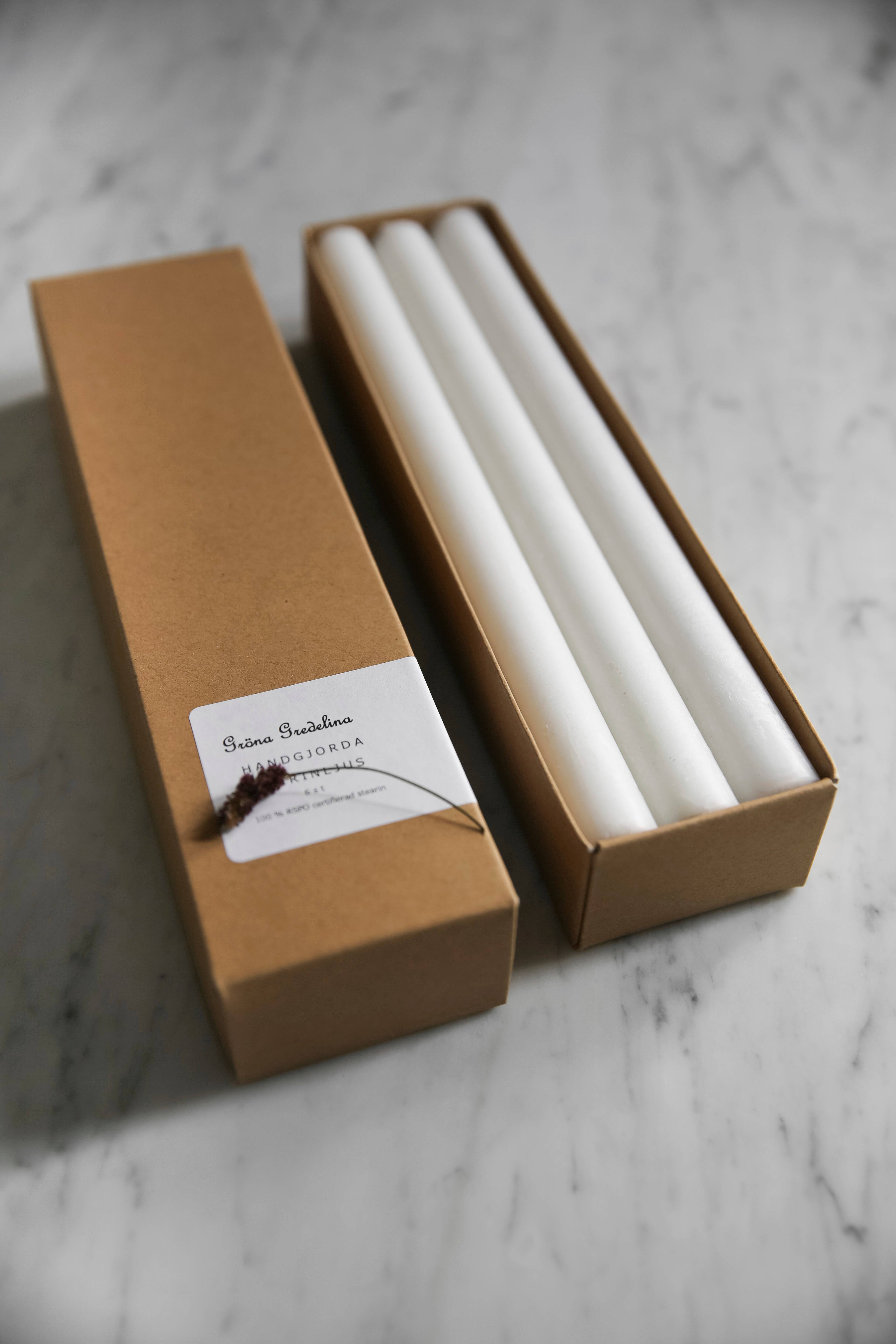 6 handstöpta stearinljus i ask av återvunnet papp. Tillverkade på traditionellt vis. Brinner klart och vackert. Brinntid: ca 7 timmar Vax: 100 % stearin av RSPO-certifierad palmolja Veke av oblekt bomull. Ingen doft. Höjd ca 26 cm. Diameter 2 cm.