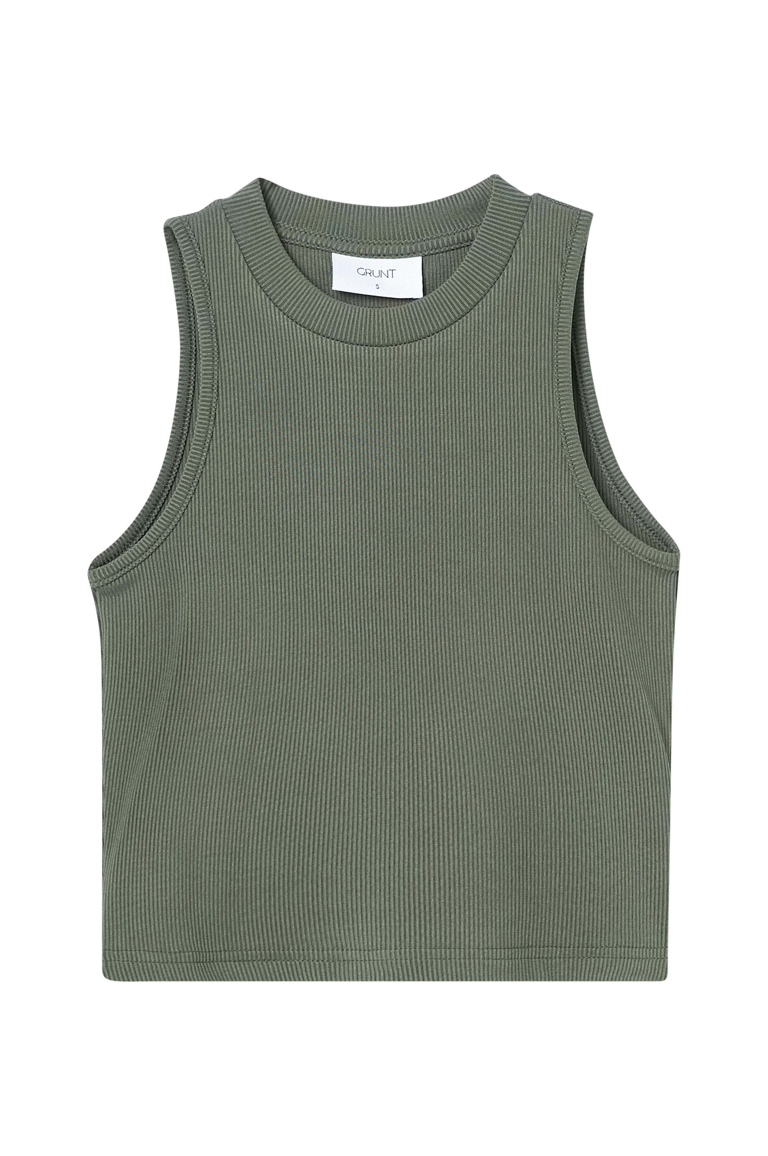 • Ärmlös topp i ribbad, stretchig trikå• Rund hals