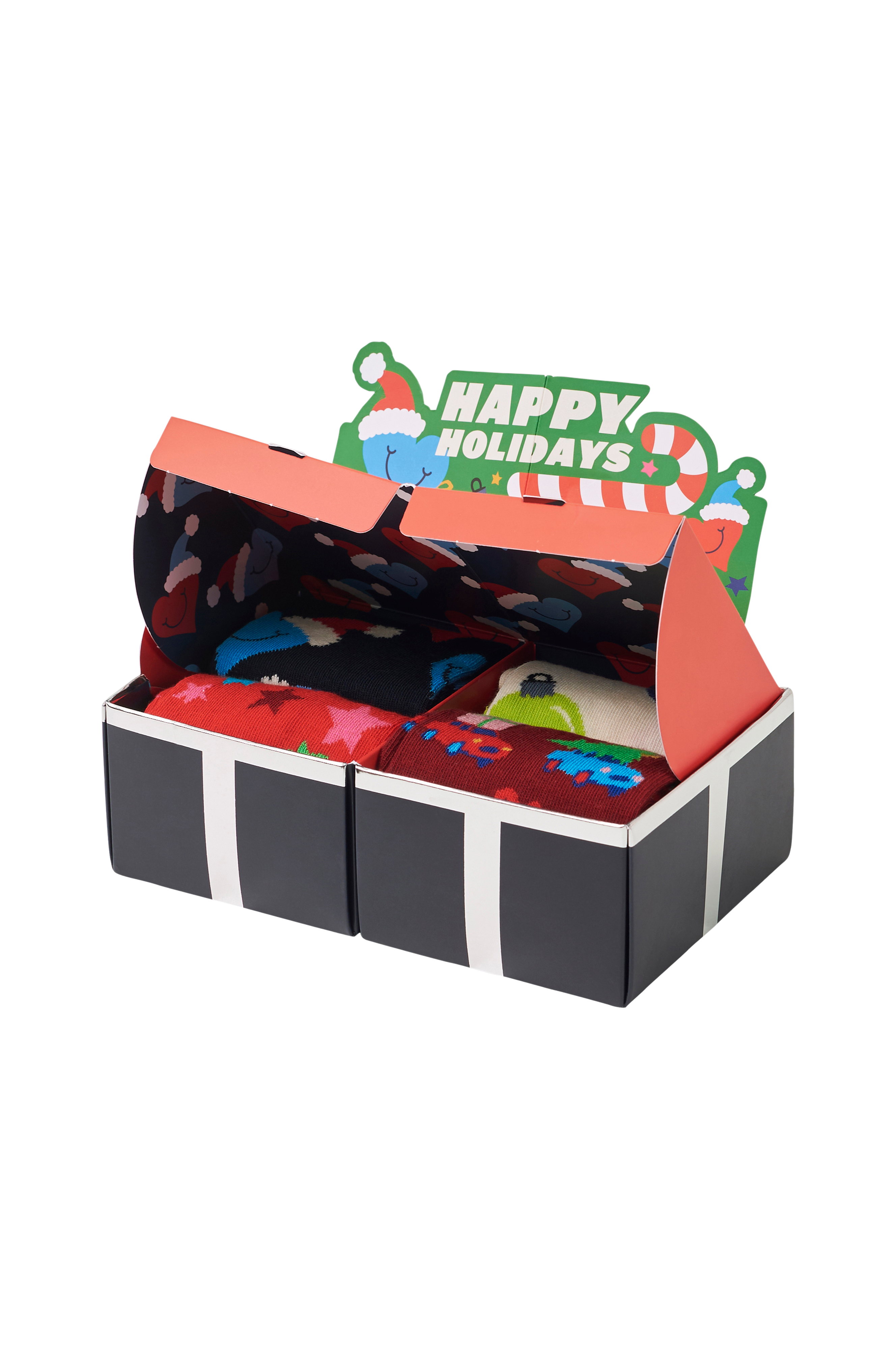 Presentask från Happy Socks som innehåller 4 par strumpor med mönster i olika färger. Ribbad kant på skaftet.