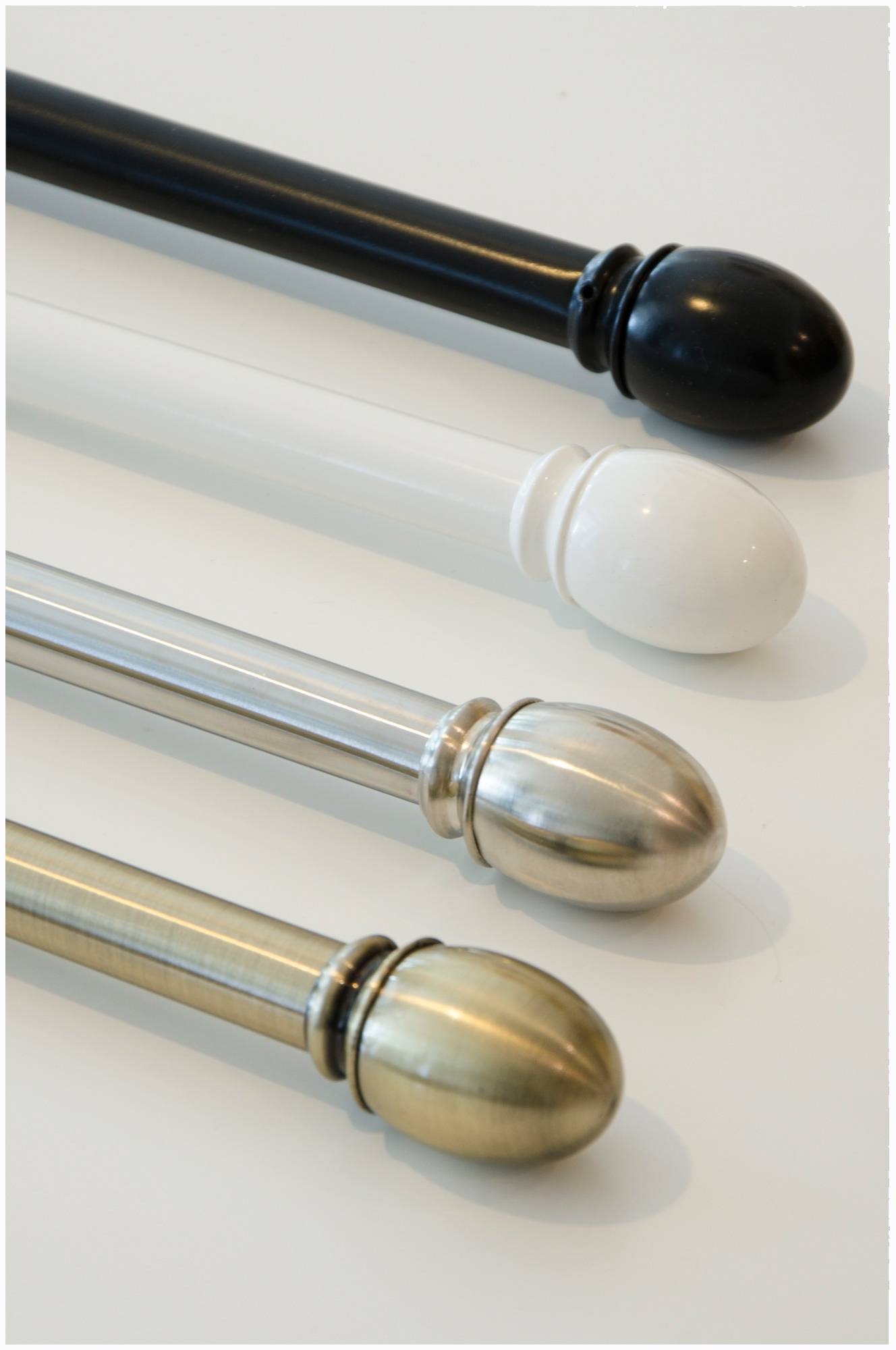 Dekorativt, komplett gardinstångset i metall, 16/19 mm. Setet innehåller justerbara stänger 130-240 cm, 2 ändknoppar och 3 st fästen.
