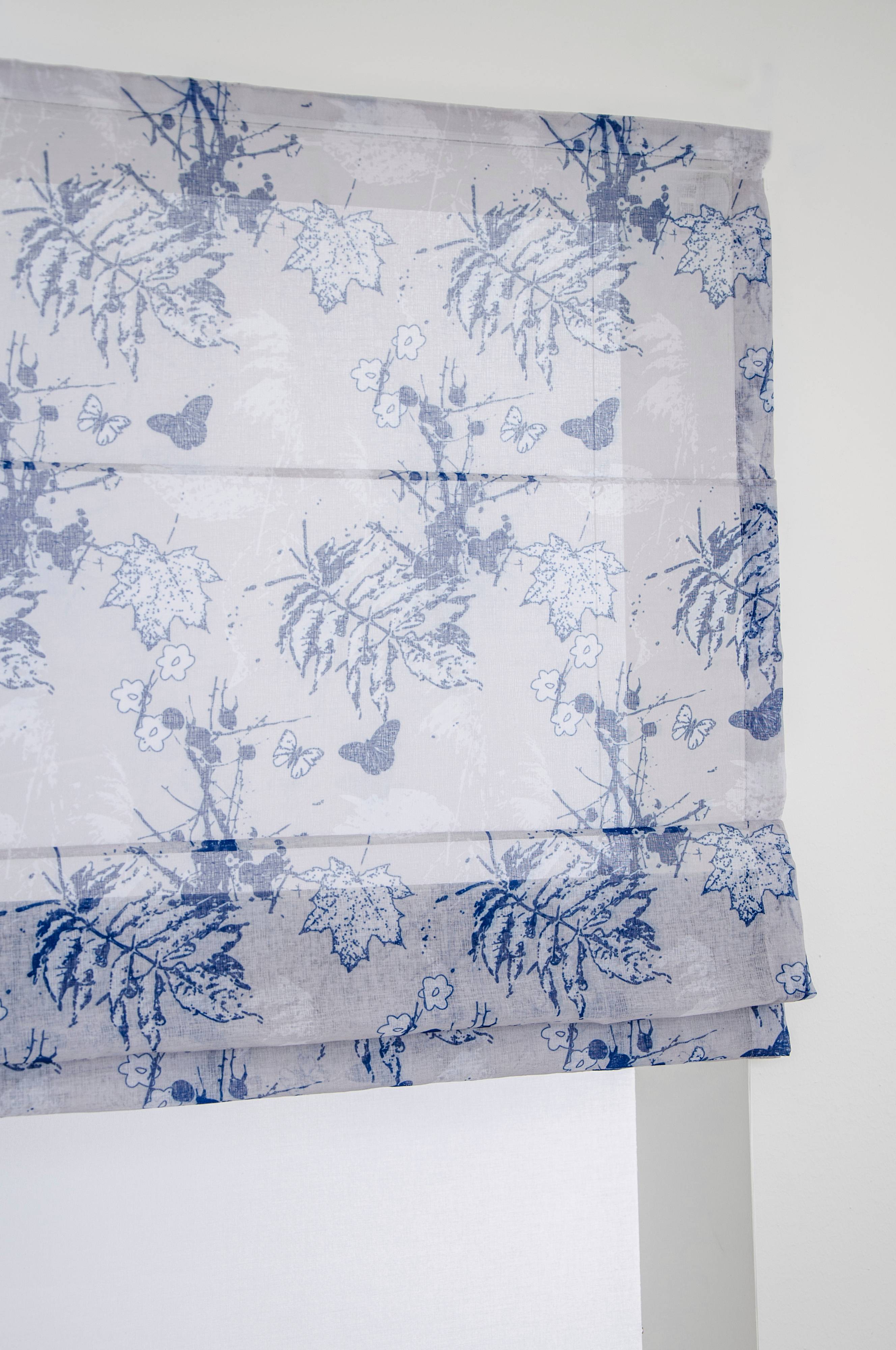 Mönstrad hissgardin med former, linjer och skuggor från foton på vår natur i blå och grå nyanser. Tyg i 100% bomull. Höjden regleras med lina. Fästanordning för lina ingår. Höjd 160 cm.