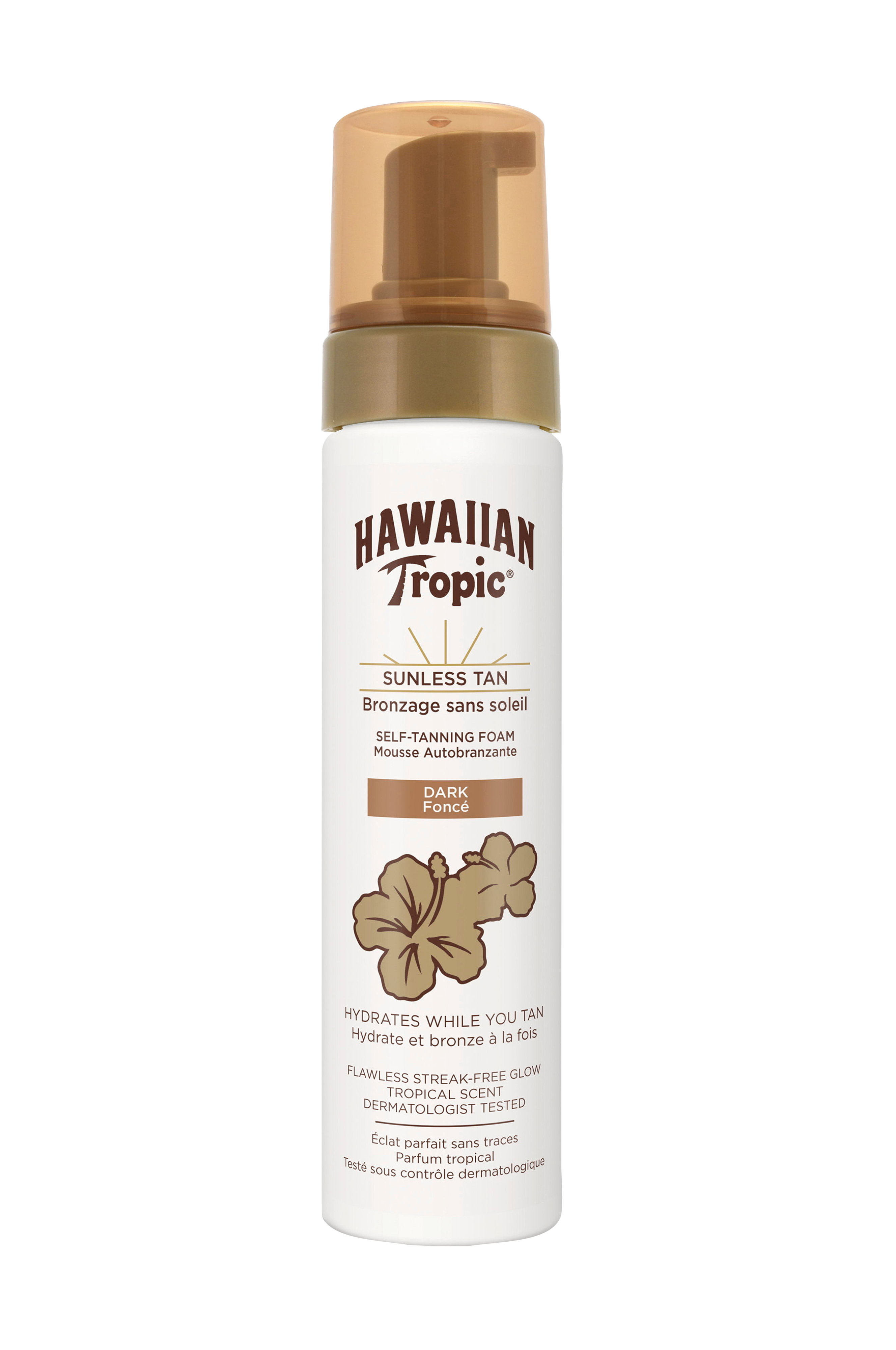 Med Hawaiian Topic Self Tanning Foam Dark kan du uppnå en naturligt djup, solbrun färg med ett professionellt resultat. Den unika blandningen av brun utan sol-ämnen bygger gradvis upp en mörk, naturlig solbrun färg. Denna brun utan sol-mousse, med en ultralätt formula, innehåller aloe vera och E-vitamin som även vårdar och återfuktar huden. Enkel att applicera utan att kladda samtidigt som den inte lämnar några ränder. Med den tropiska doften som för tankarna till Hawaii!