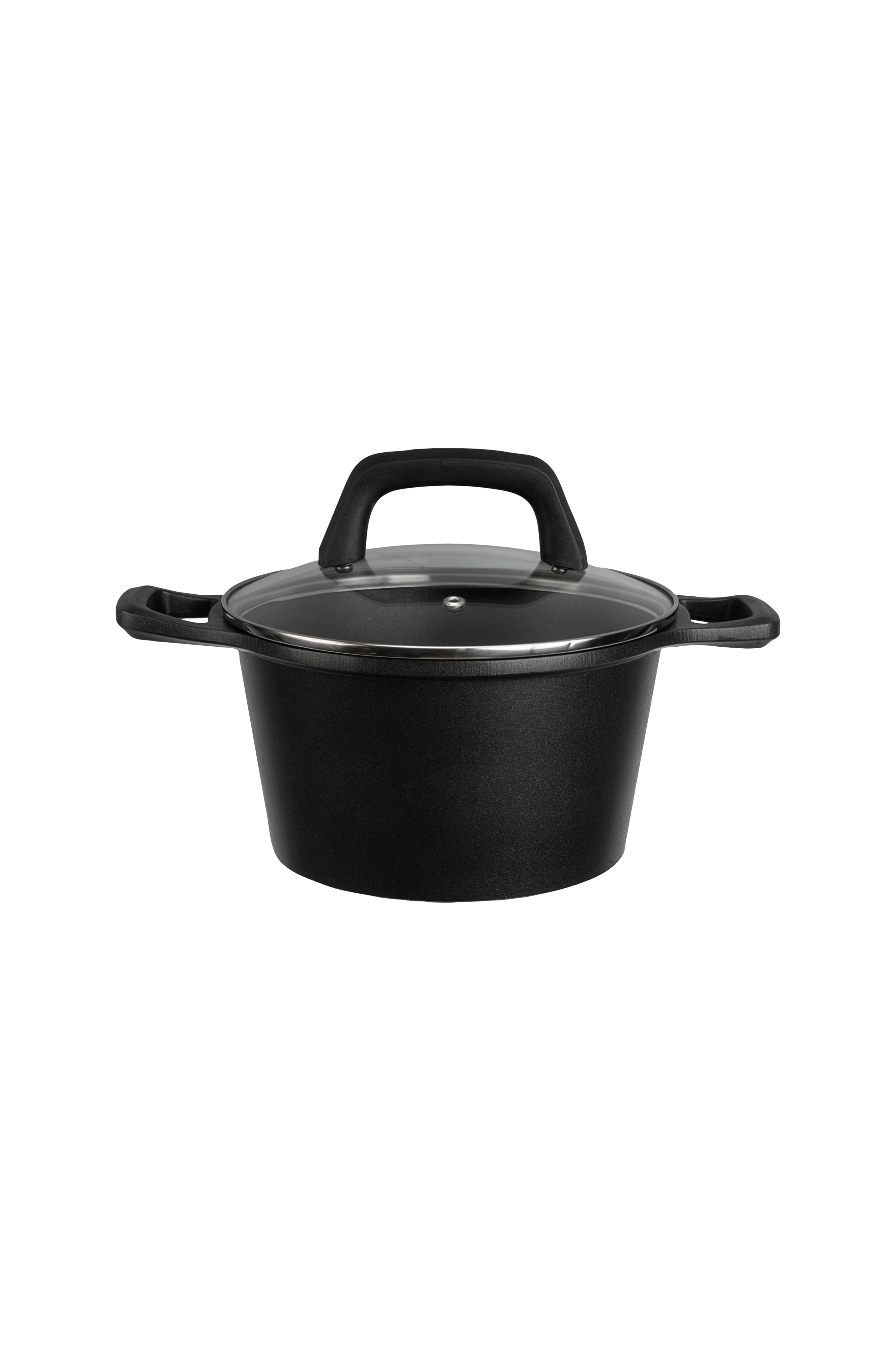 En kastrull med dubbla handtag och förstärkt keramisk beläggning, 20 cm. Grytan har en 6 mm tjock botten i rostfritt stål och är kompatibel med alla typer av spishällar. Den levereras med ett glaslock. Den kan maskindiskas, men handtvätt hjälper till att bevara beläggningen. Den är pfas-fri och rymmer 3 liter.