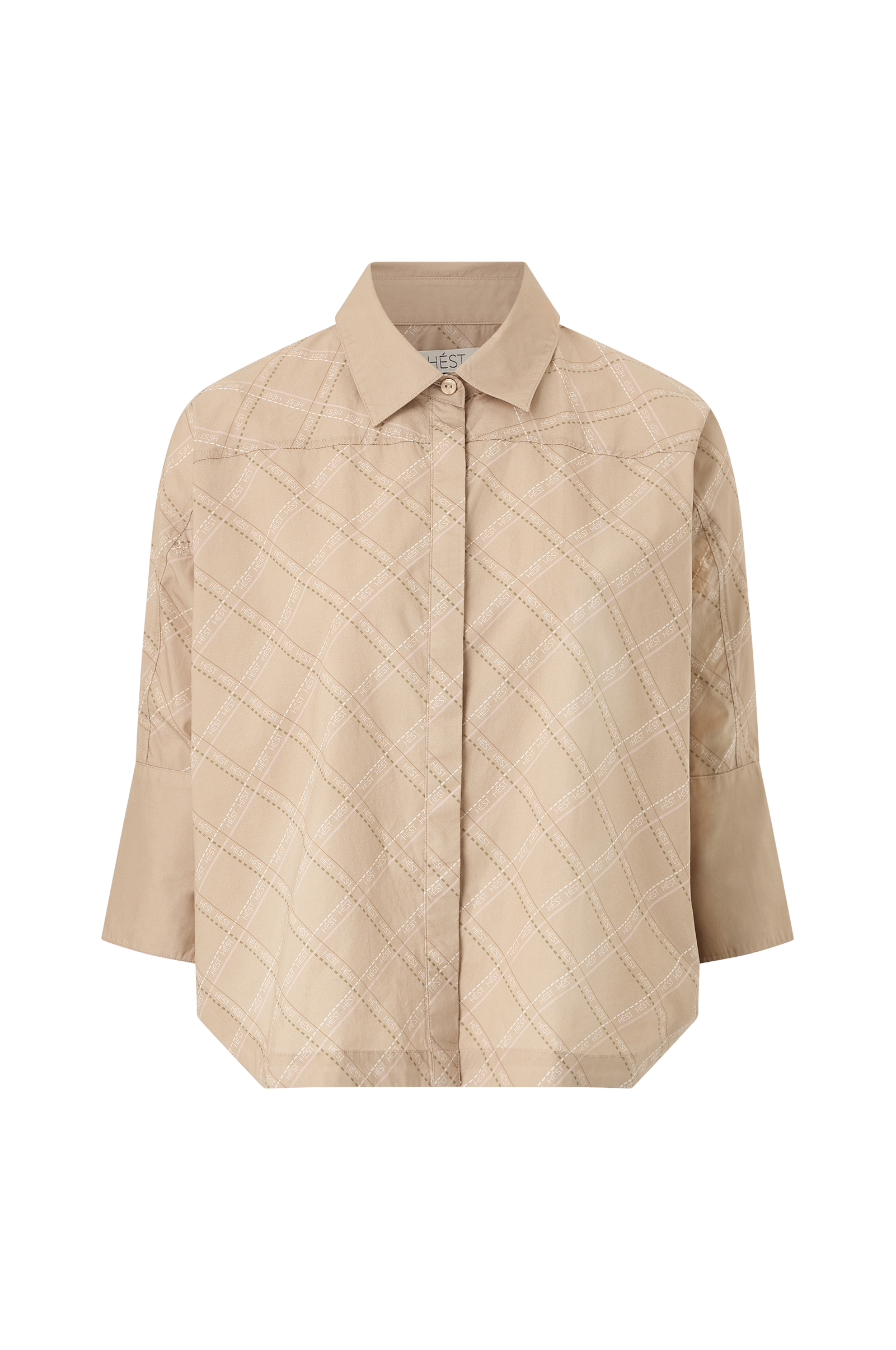 • Skjorta med 3/4-långa ärmar och knappar i ärmsluten• Krage• Dold knappslå• Rundad nederkant