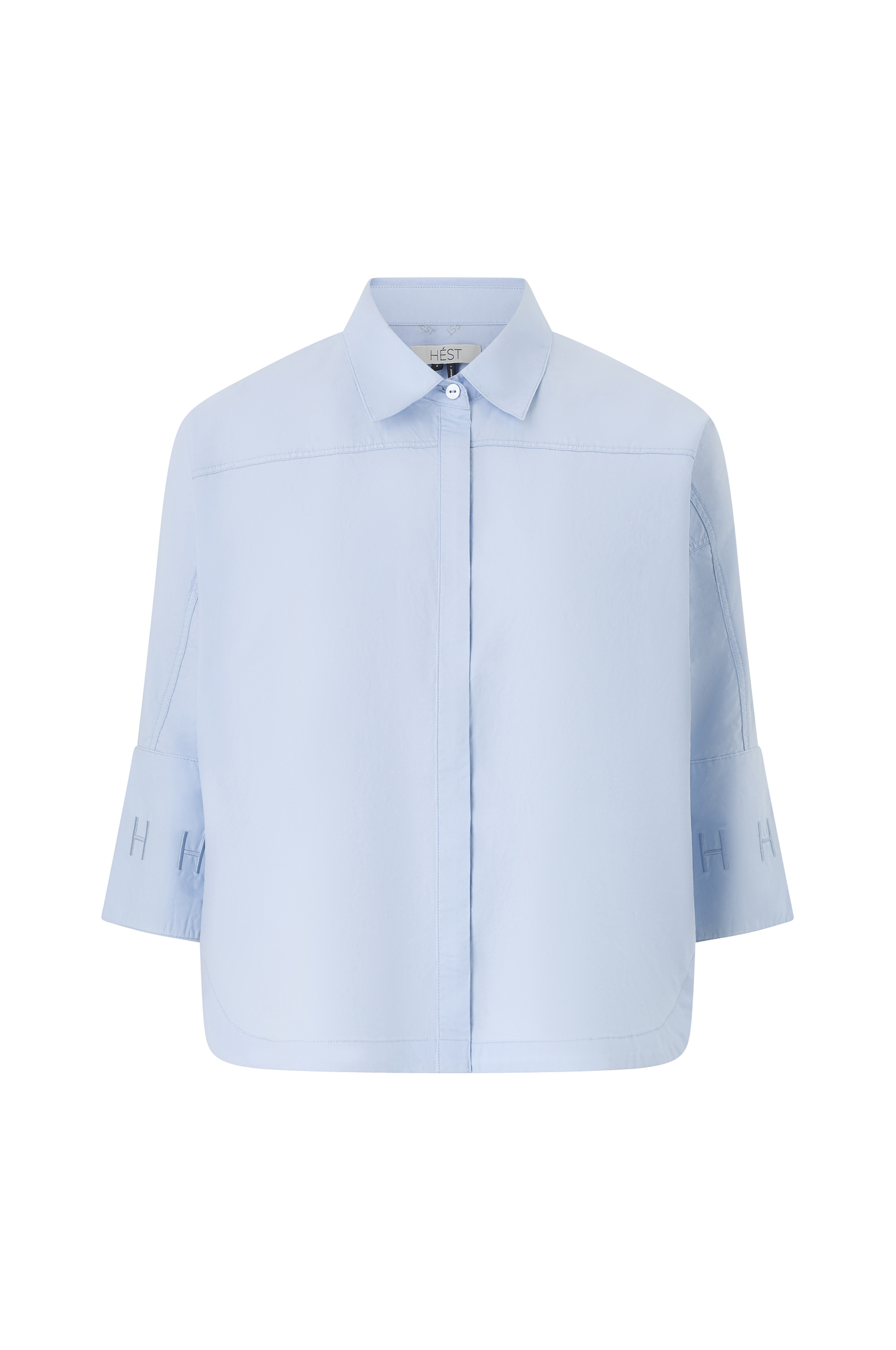 • Skjorta med 3/4-långa ärmar och knappar i ärmsluten• Krage• Dold knappslå• Rundad nederkant