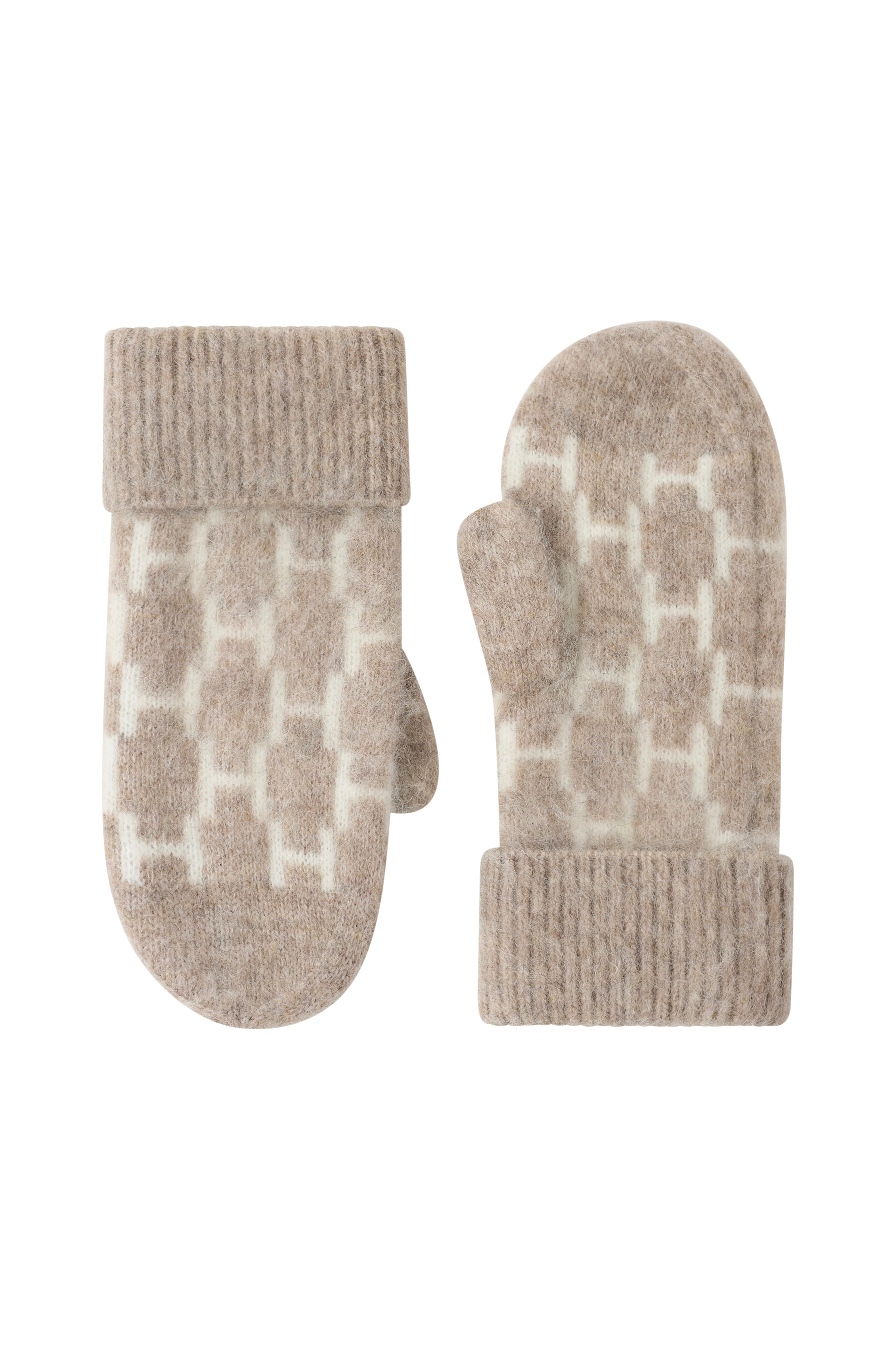 • Finstickade tumvantar i ullmix med logga runt om• Uppvikt, ribbstickad nederkant