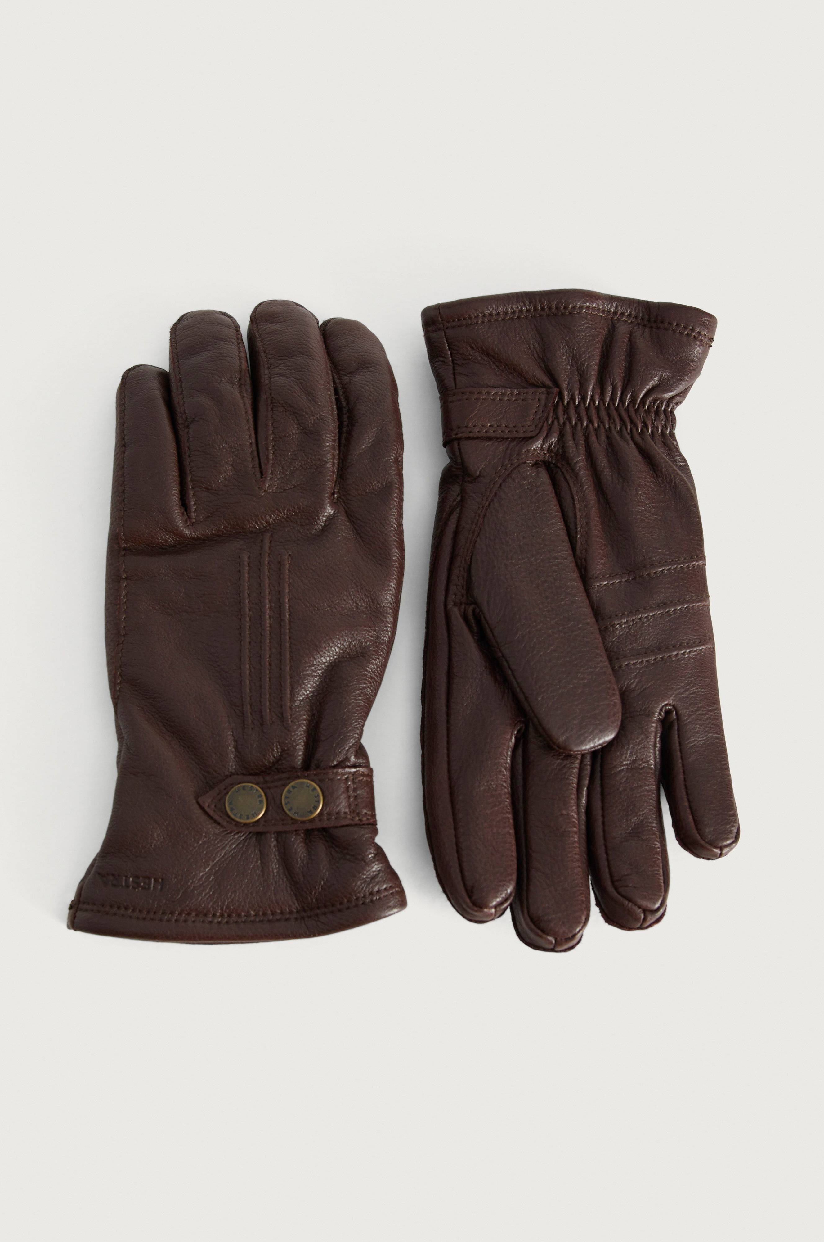Handskar från Hestra i äkta läder. Handskarna är fodrade i ett mjukt tyg och på ovansidan finns en slejf. Upptill finns en liten logotyp.