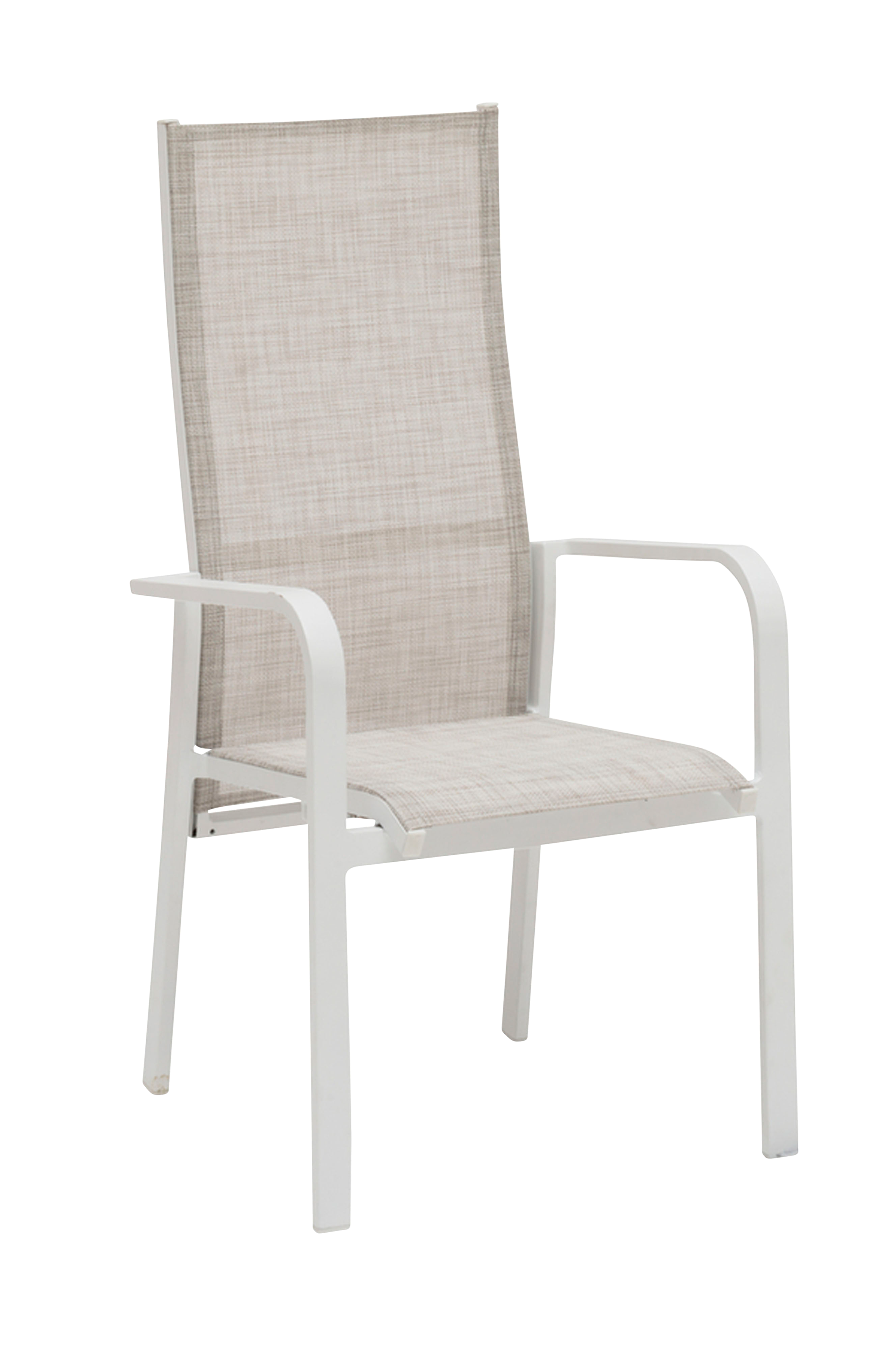 Positionsfåtöljl i vit aluminium och gråbeige textilene.