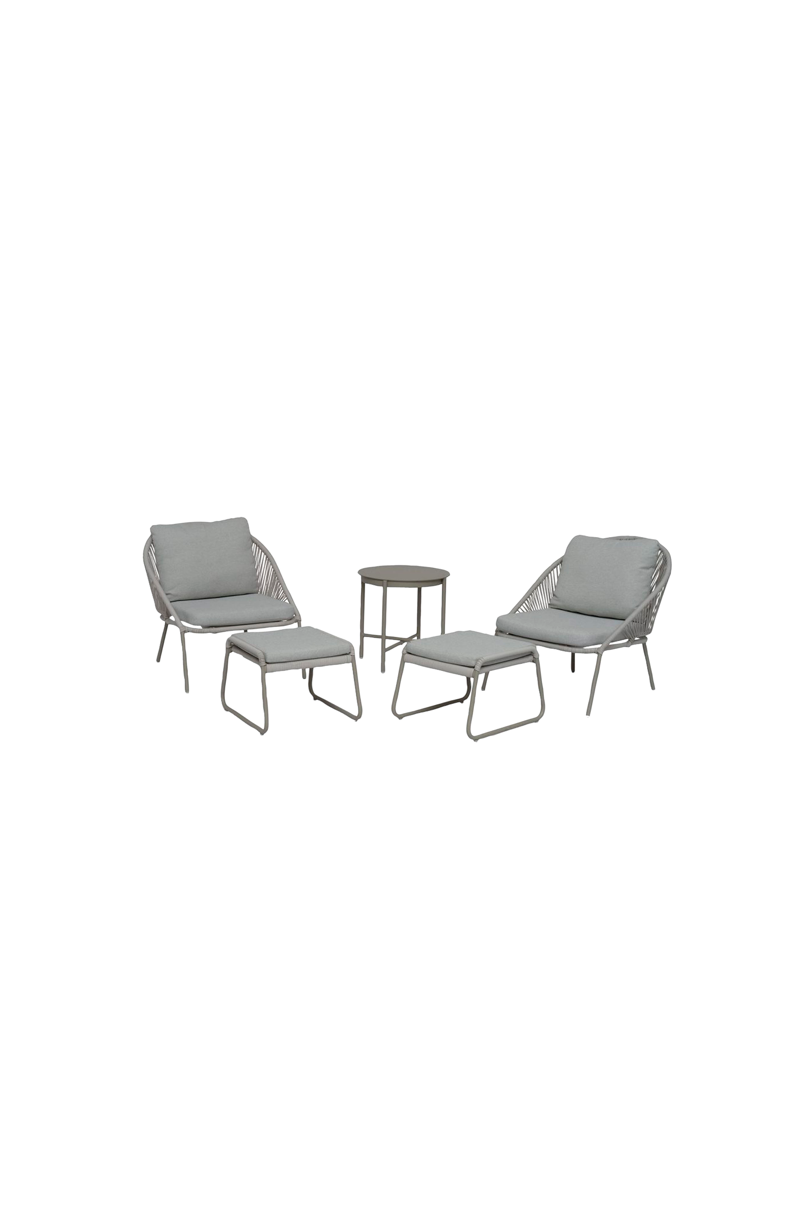 en mindre, nätt duo i en modern och sober design. Passar lika bra på en mindre uteplats som på en balkong eller i ett favorithörn i trädgården. Komplett set innehållande två fåtöljer, två fotpallar och ett bord. Tillverkad i aluminium med rep i olefin och dynor i beige olefin med hög textur. Bordsskiva i glas. Addera ett charmigt strandparasoll och en matta för att skapa den perfekta miljön för det mindre utrymmet. Mått: fåtölj 71x81x77 cm, pall 46x53x37 cm och bord ø50x51,5 cm.