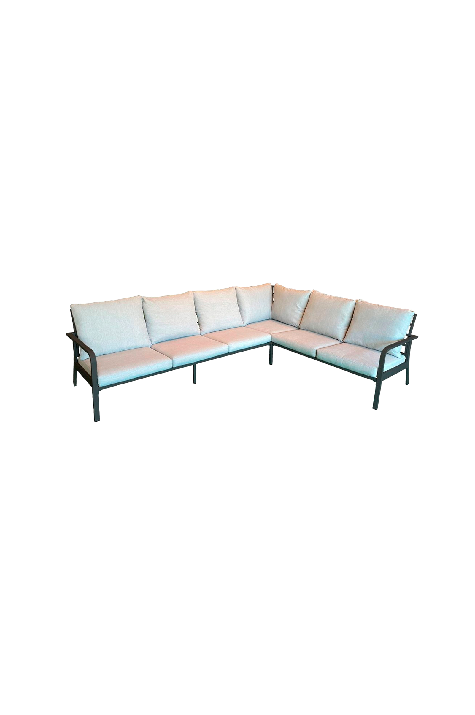Generös hörnsoffa som med sin lätta design skapar ett stilrent och modernt uttryck. Utformad för maximal komfort med bra sittlutning. Hörnsoffan är vändbar, så du kan välja om du vill ha den vänster- eller högerställd. Tillverkad i aluminium med kuddar i gråbeige olefin. Avtagbart överdrag, handtvätt 30 grader. Bordet säljs separat. Välj mellan ett högt eller lågt bord!