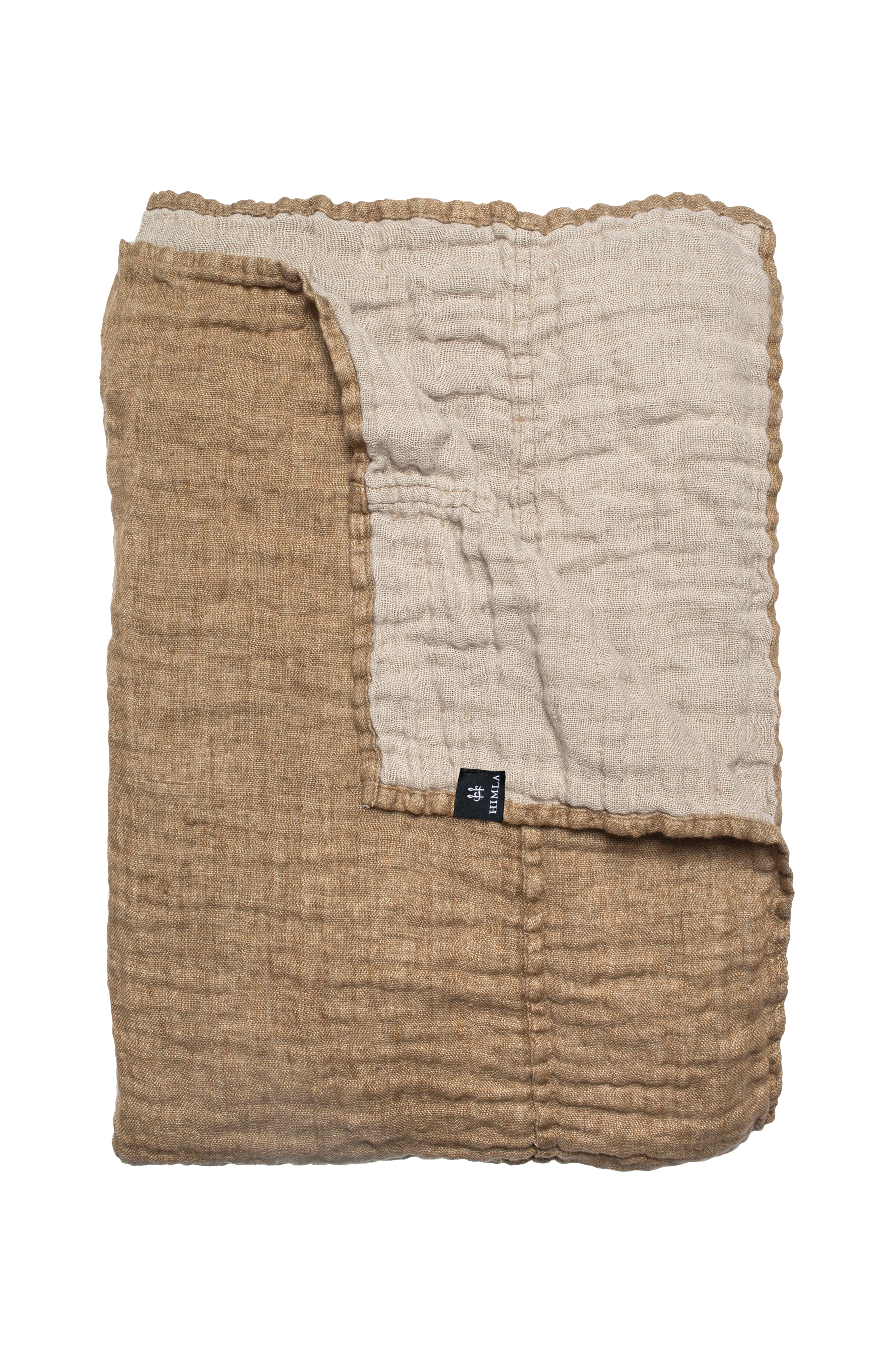 Överkast i bondat dubbelvävt linne, tvättat för att få en skrynklig look. Överkastet har olikfärgade, kontrasterande sidor, vilket gör det mer iögonfallande. Den krusade strukturen ger ett avslappnat och inbjudande uttryck och är lätt att slänga på sängen. Hannelin överkast finns för enkelsäng och dubbelsäng och finns i flera färger och fungerar utmärkt att kombinera med plädar och kuddar från samma serie för att skapa en riktigt mysig säng. Överkastet har dubbla sömmar längs varje sida; på storlek 160x260 är sömmen placerad 15 cm från sidokanten och på storlek 260x260 är sömmen placerad 65 cm från sidokanten. Maskintvätt 40°C skonsam tvätt, torktumling på låg värme, tvättas separat. Kan krympa 1-2%.