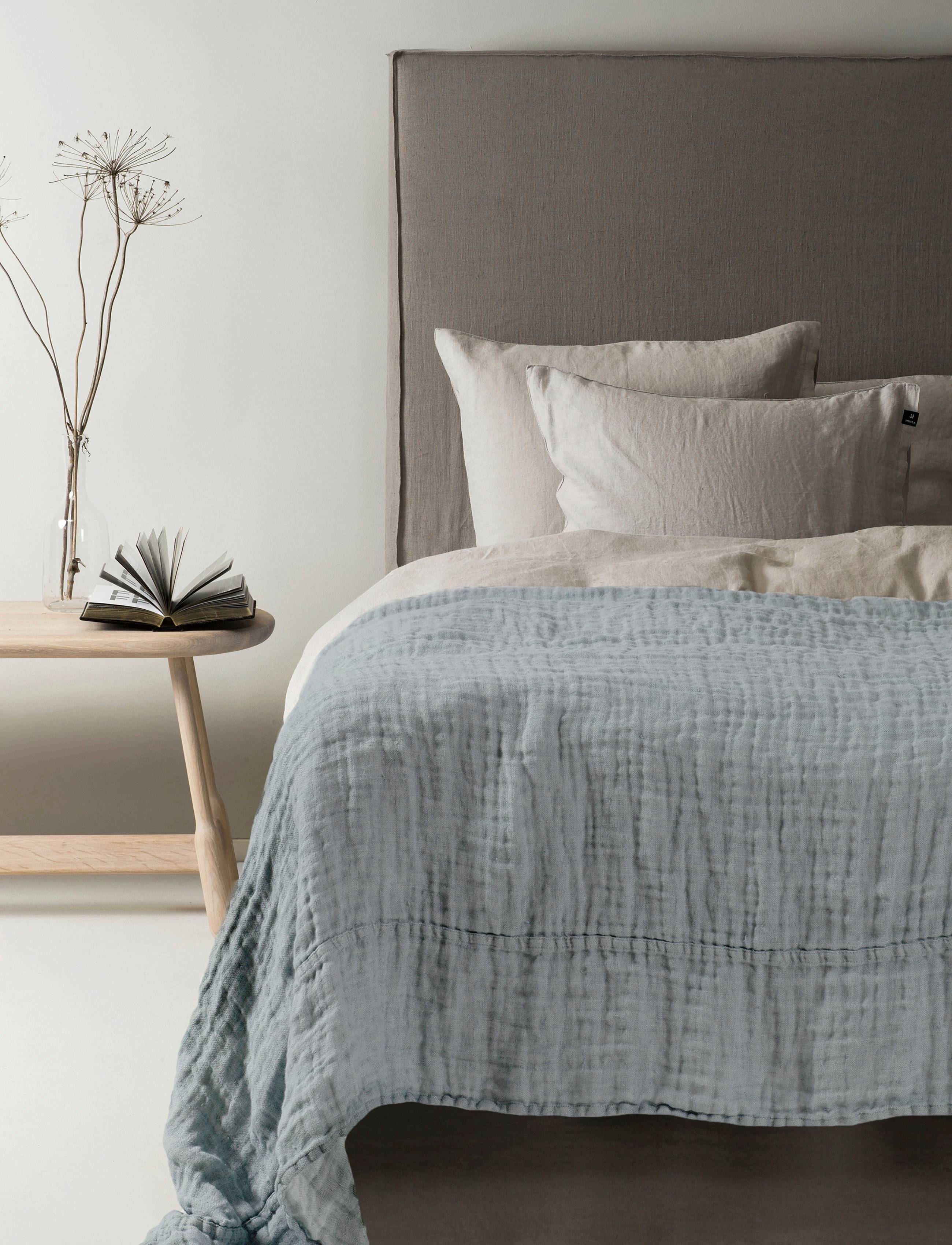 Överkast i bondat dubbelvävt linne, tvättat för att få en skrynklig look. Överkastet har olikfärgade, kontrasterande sidor, vilket gör det mer iögonfallande. Den krusade strukturen ger ett avslappnat och inbjudande uttryck och är lätt att slänga på sängen. Hannelin överkast finns för enkelsäng och dubbelsäng och finns i flera färger och fungerar utmärkt att kombinera med plädar och kuddar från samma serie för att skapa en riktigt mysig säng. Överkastet har dubbla sömmar längs varje sida; på storlek 160x260 är sömmen placerad 15 cm från sidokanten och på storlek 260x260 är sömmen placerad 65 cm från sidokanten. Maskintvätt 40°C skonsam tvätt, torktumling på låg värme, tvättas separat. Kan krympa 1-2%.