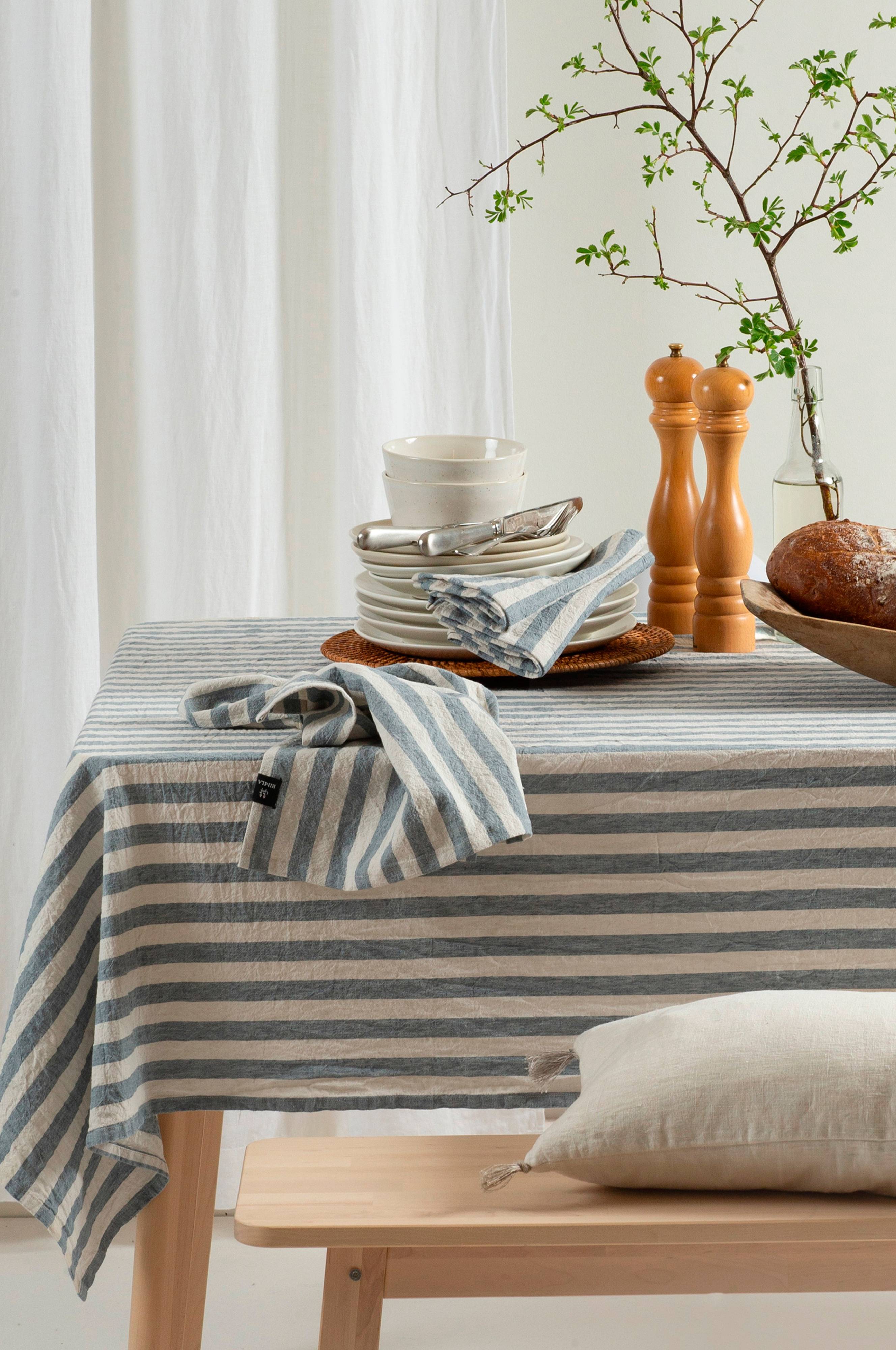 Riviera är en kollektion i halflinen med tydliga ränder i somriga färger. Servetterna tvättas efter sömnad, vilket ger ett avslappnat uttryck och en mjuk känsla. Riviera är lättskött: efter tvätt, torktumla lätt på låg temperatur och behåll skrynklorna för en livlig känsla. Säljs som 4-pack. Maskintvätt 60°C, krympning 3-5%.