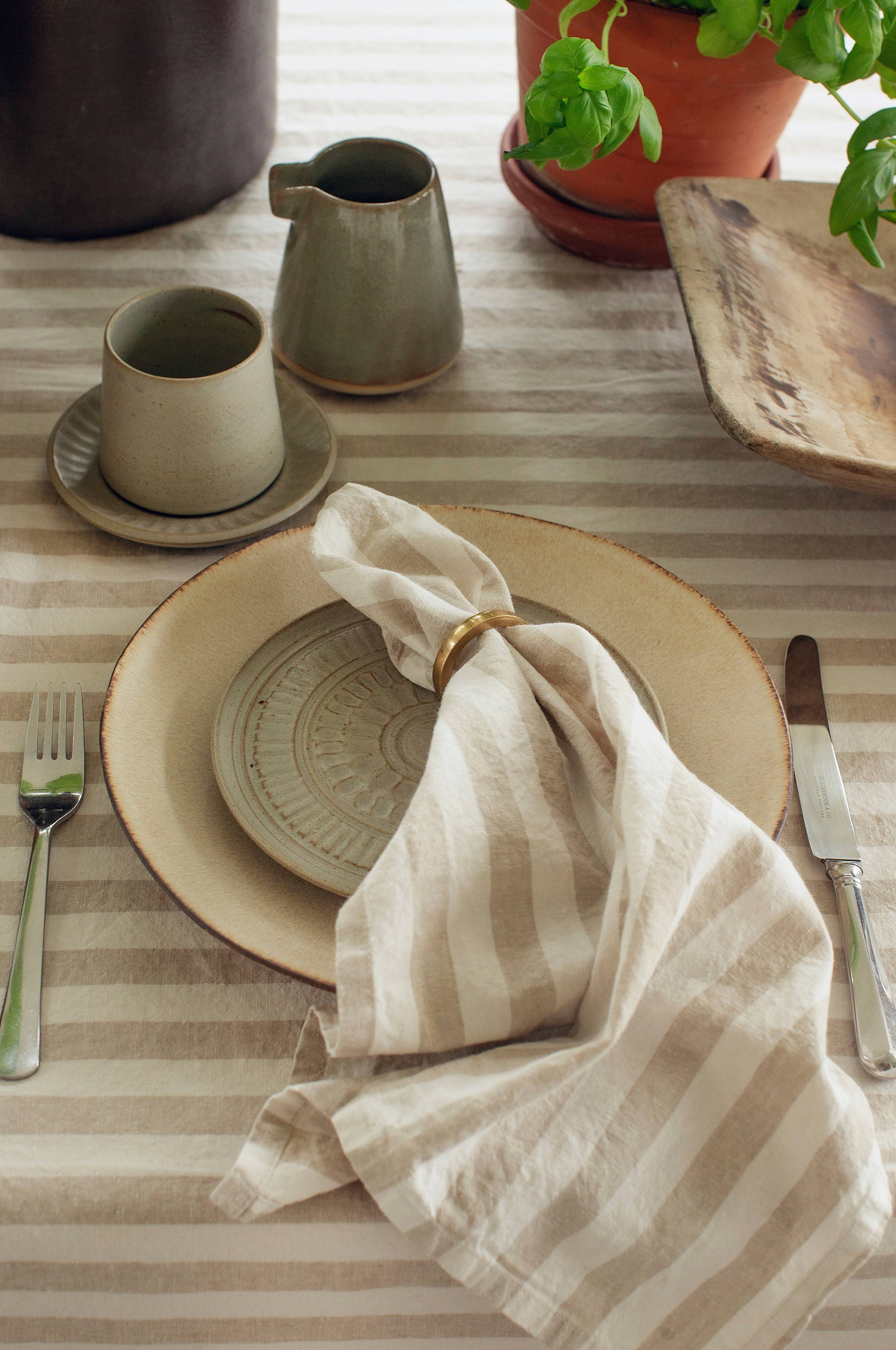 Riviera är en kollektion i halflinen med tydliga ränder i somriga färger. Servetterna tvättas efter sömnad, vilket ger ett avslappnat uttryck och en mjuk känsla. Riviera är lättskött: efter tvätt, torktumla lätt på låg temperatur och behåll skrynklorna för en livlig känsla. Säljs som 4-pack. Maskintvätt 60°C, krympning 3-5%.