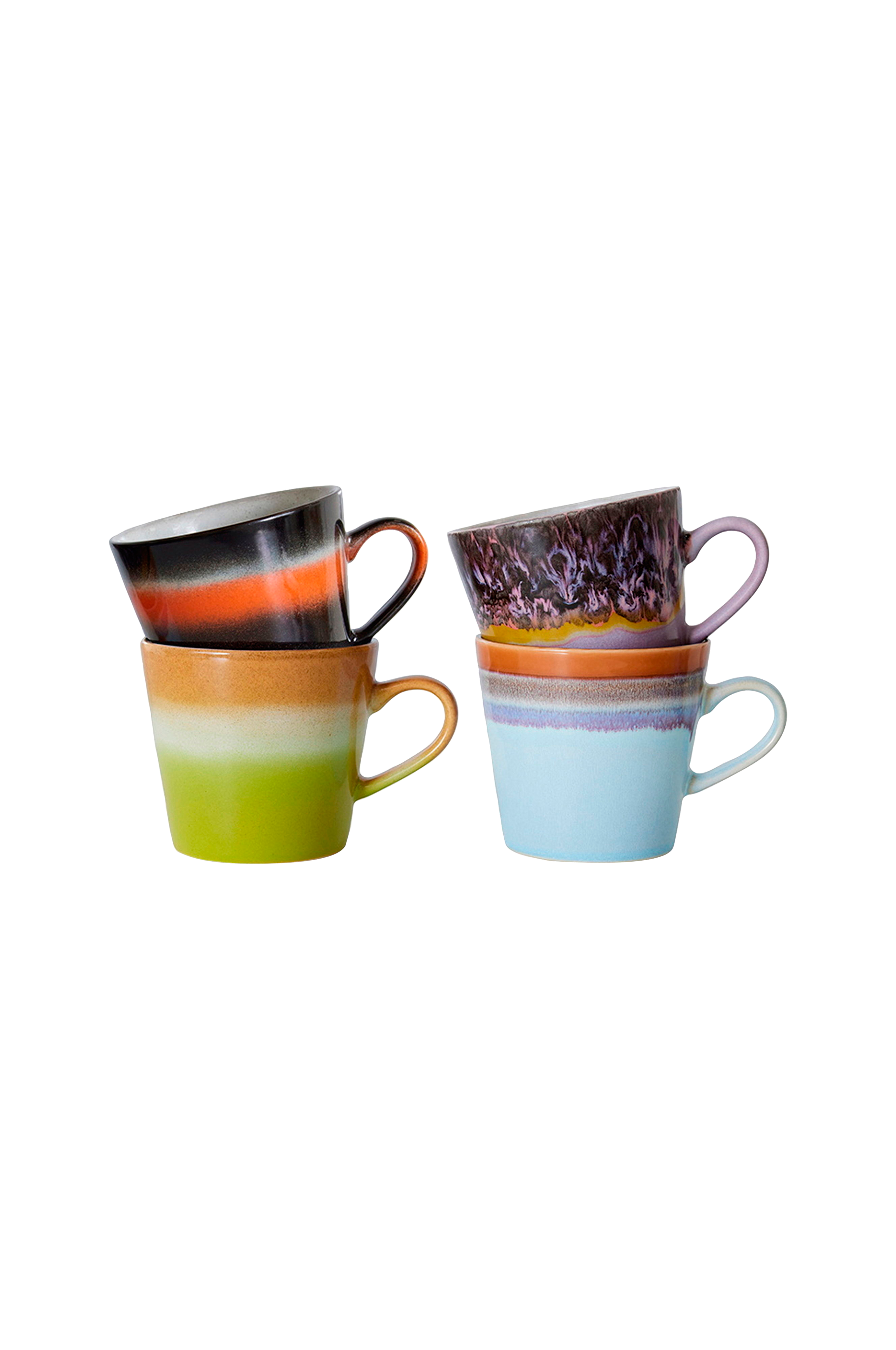 Cappuccino muggarna rymmer 300 ml, och har fina färgkombinationer i en retro 70-tals inspererande keramik kollektion. De texturerade och handgjorda ytor gör varje del unik. Material: Stengods med reaktiv glasyr. Mått: 12x9,5x8,5cm. Kan användas i mikrovågsugn, samt diskmaskin. Food safe.