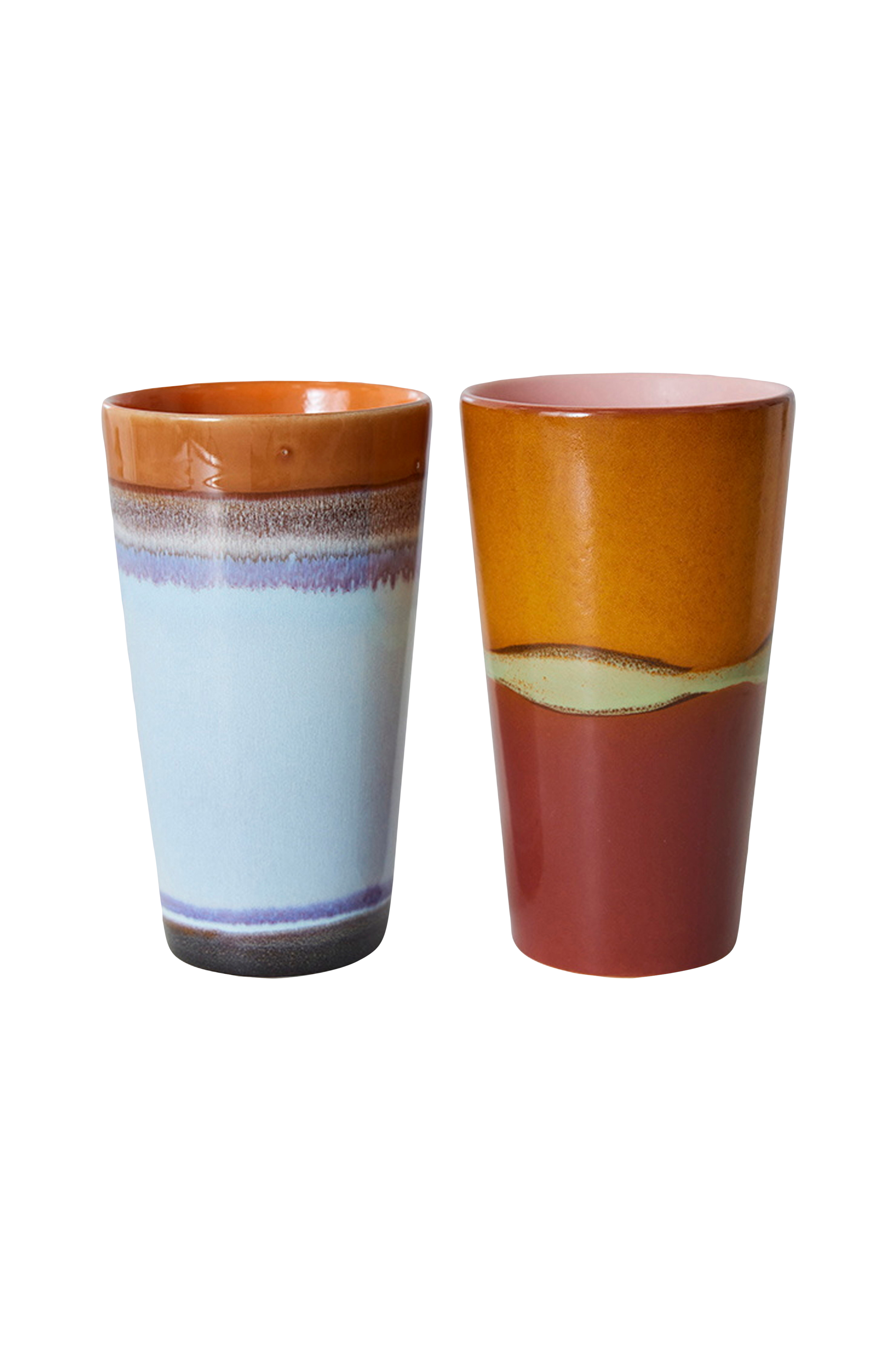 Lattemuggarna rymmer 280 ml, och och har fina färgkombinationer i en retro 70-tals inspererande keramik kollektion. De texturerade och handgjorda ytor gör varje del unik. Material: Stengods med reaktiv glasyr. Mått: 7,5x7,5x13cm. Kan användas i mikrovågsugn, samt diskmaskin. Food safe.
