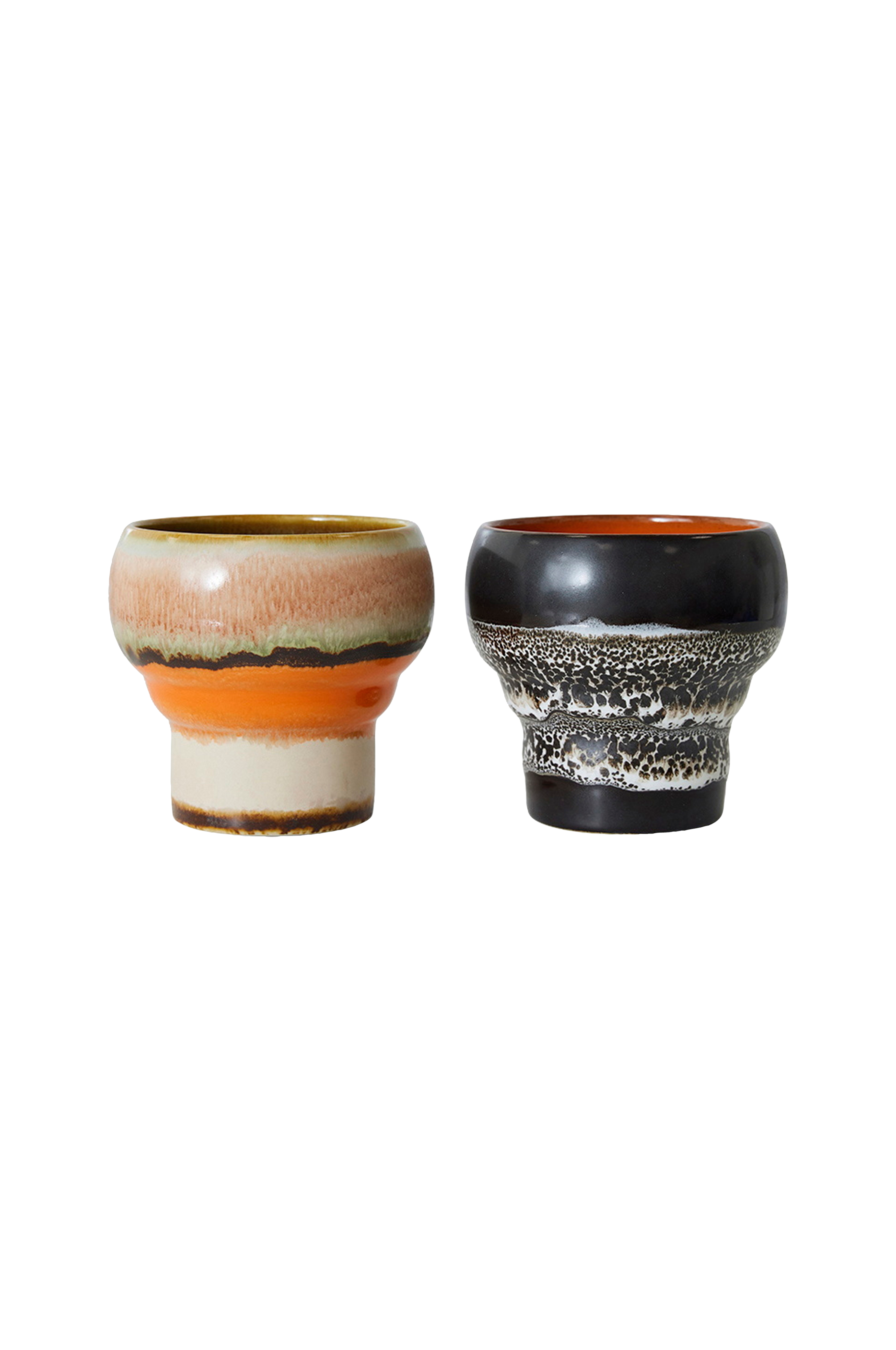 Lungo muggarna är ett lekfullt tillskott till 70-talets keramik med reaktiv glasyr, och är en av HKlivings favoriter. Diameter 8,9 cm. Kan användas i mikrovågsugn, samt diskmaskin. Food safe.