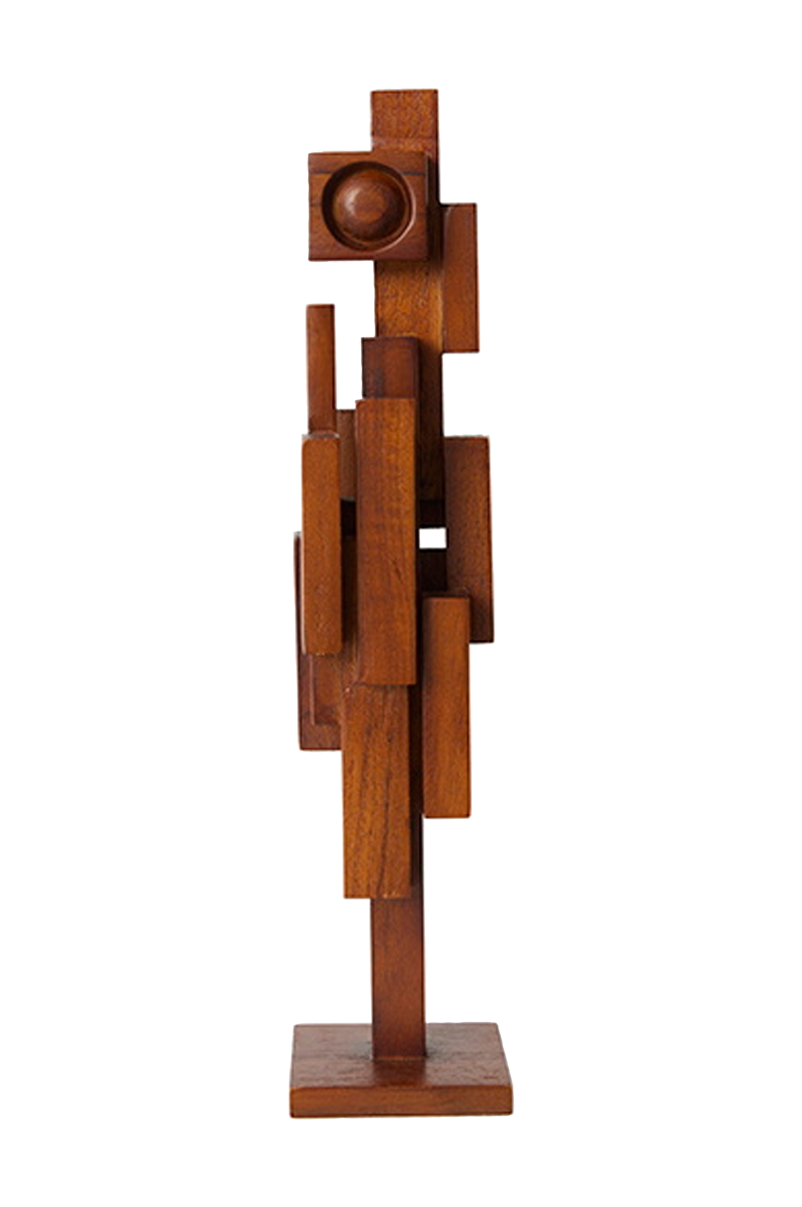 Med sin brutalistiska form och lekfulla komposition är denna prydnad en slående accessoar inspirerad av stadens silhuetter. Tillverkad av teak.