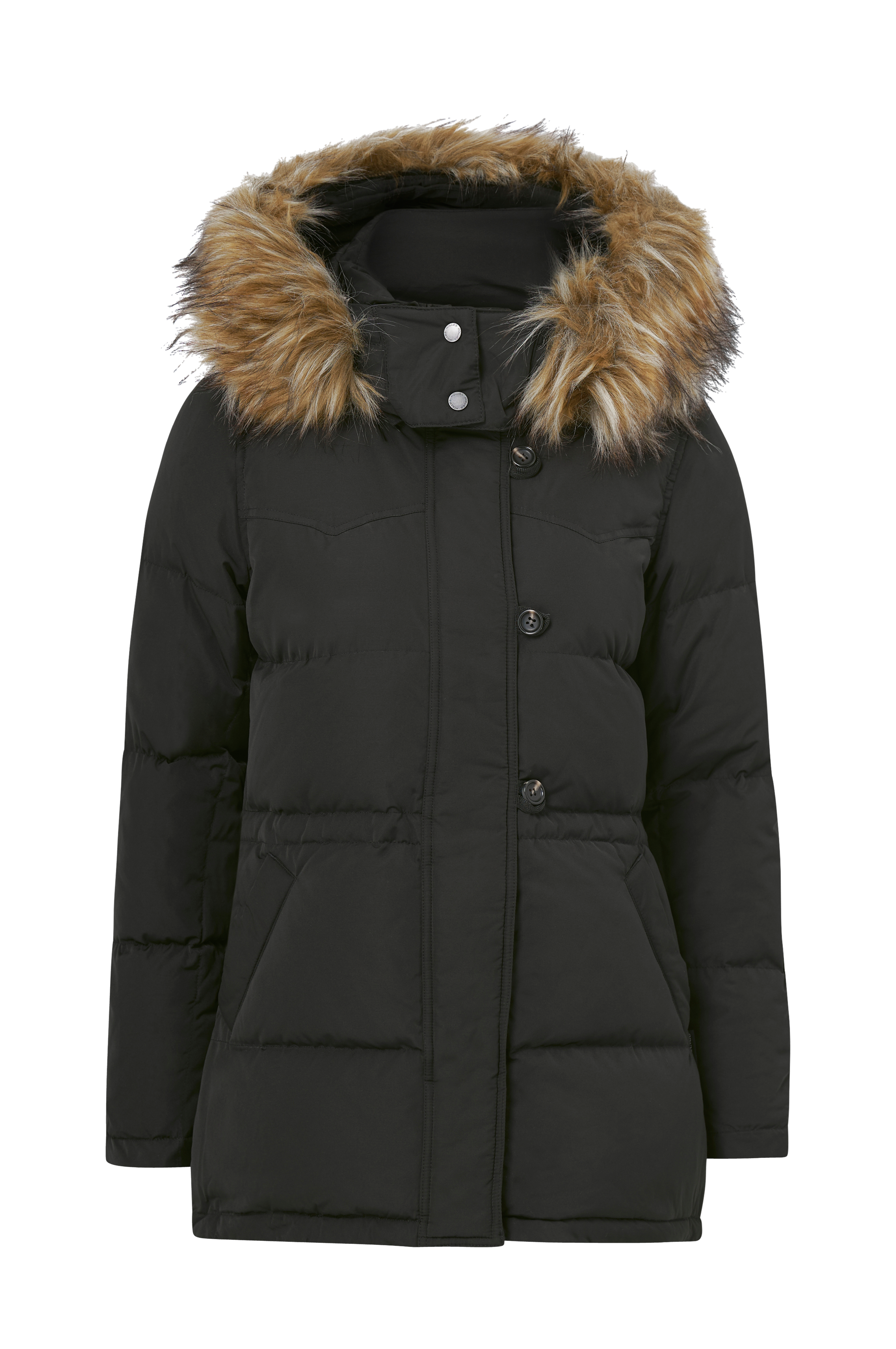 Medellång jacka med värmande vaddering av dunmix. Lätt figursydd passform med justerbar midja. Tvåvägsdragkedja och vindslå med tryckknappar fram. Två öppna fickor med fleecefoder. Avtagbar huva med avknäppbar fuskpäls. Dold ribbmudd i ärmsluten. Längd ca 73 cm i stl 36.