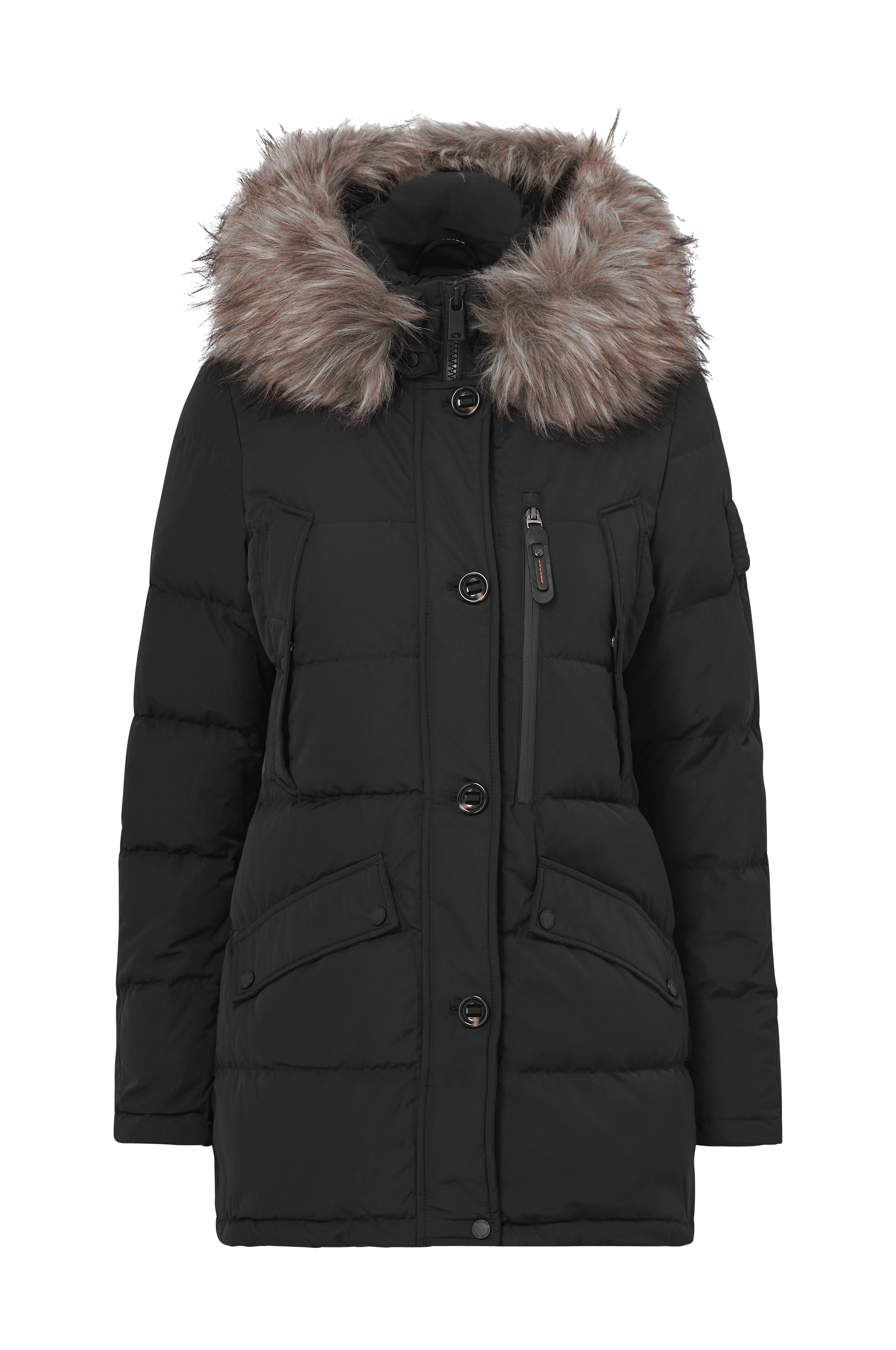 Jacka i lätt figursydd modell med värmande dunmixvaddering. Tvåvägsdragkedja och vindslå med knappar fram. Totalt fem fickor fram. Avtagbar huva med avknäppbar fuskpälskant. Dold ribbmudd i ärmsluten. Längd ca 73 cm i stl 36.