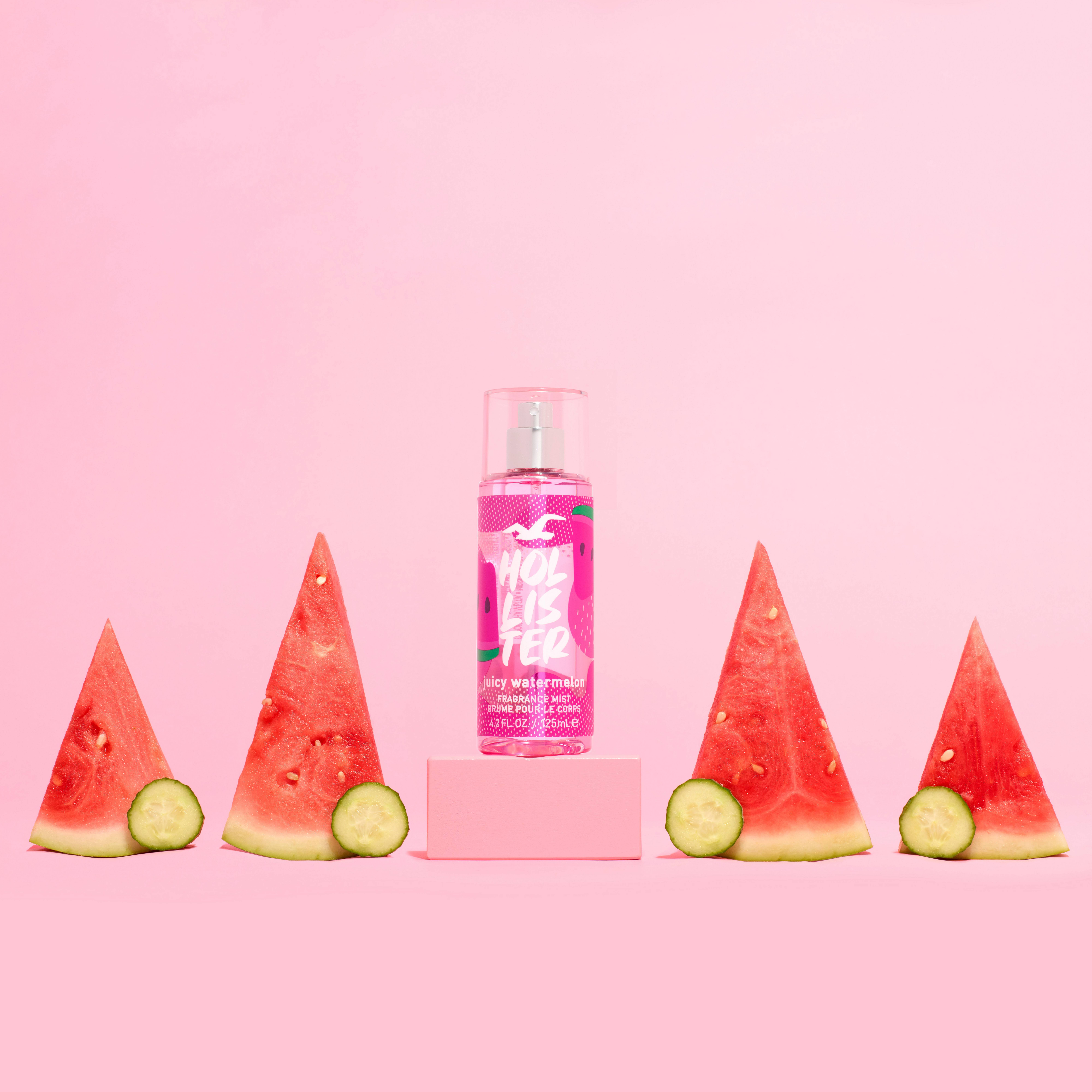 Juicy Watermelon är en fruktig, blommig body mist. Doften öppnar upp med saftig vattenmelon i kombination med friskhet från marina noter och citrus som fängslar sinnena. Ett upplyftande och aromatiskt hjärta av hållbar lavendel, mimosa och krispig gurka släpper fram en bekymmerslös och samtida kvinnlighet. I basen möter en mjuk värme av bärnsten och jordnära vetiver en mjölkig persika.