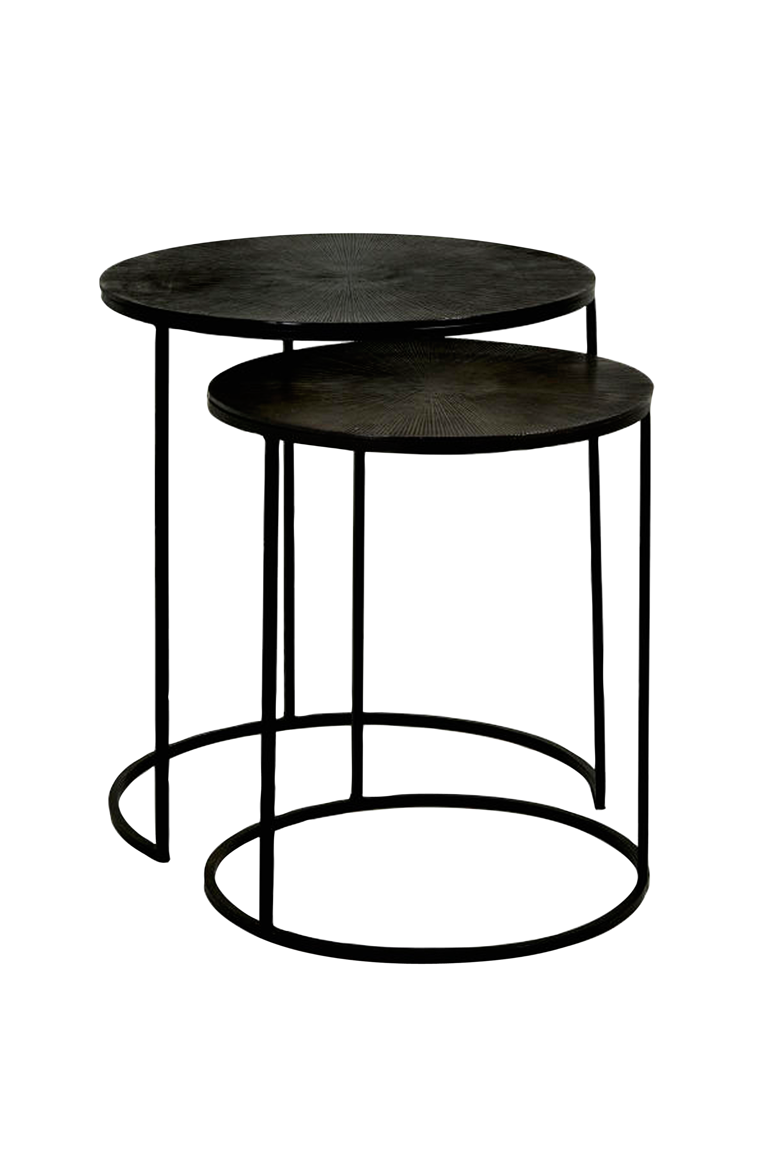 Snyggt sidobord av metall med räfflad topp. Mått; Stora bordet, diameter 49, höjd 52 cm. Lilla bordet, diameter 41 höjd 46 cm.