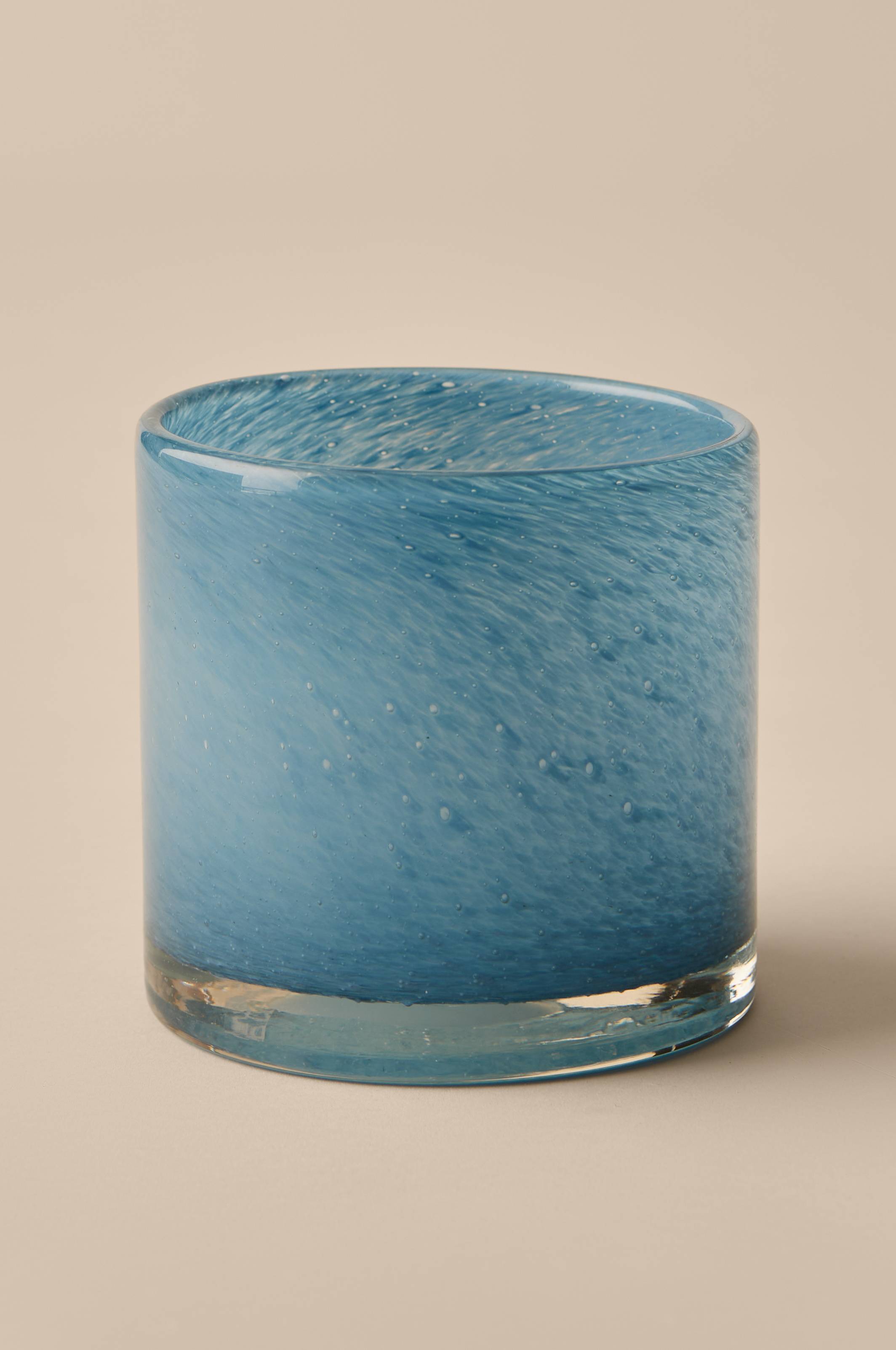 Ljuslykta eller liten kruka i glas. Färgen har vackra skiftningar och glaset har bubblor i sig som skapar fint uttryck och ett stämningsfullt ljussken. Tekniken gör att ojämnheter och färgskillnader förekommer och varje ljuslykta blir unik. Höjd ca 15 cm, Ø ca 15 cm. Rengörs för hand.