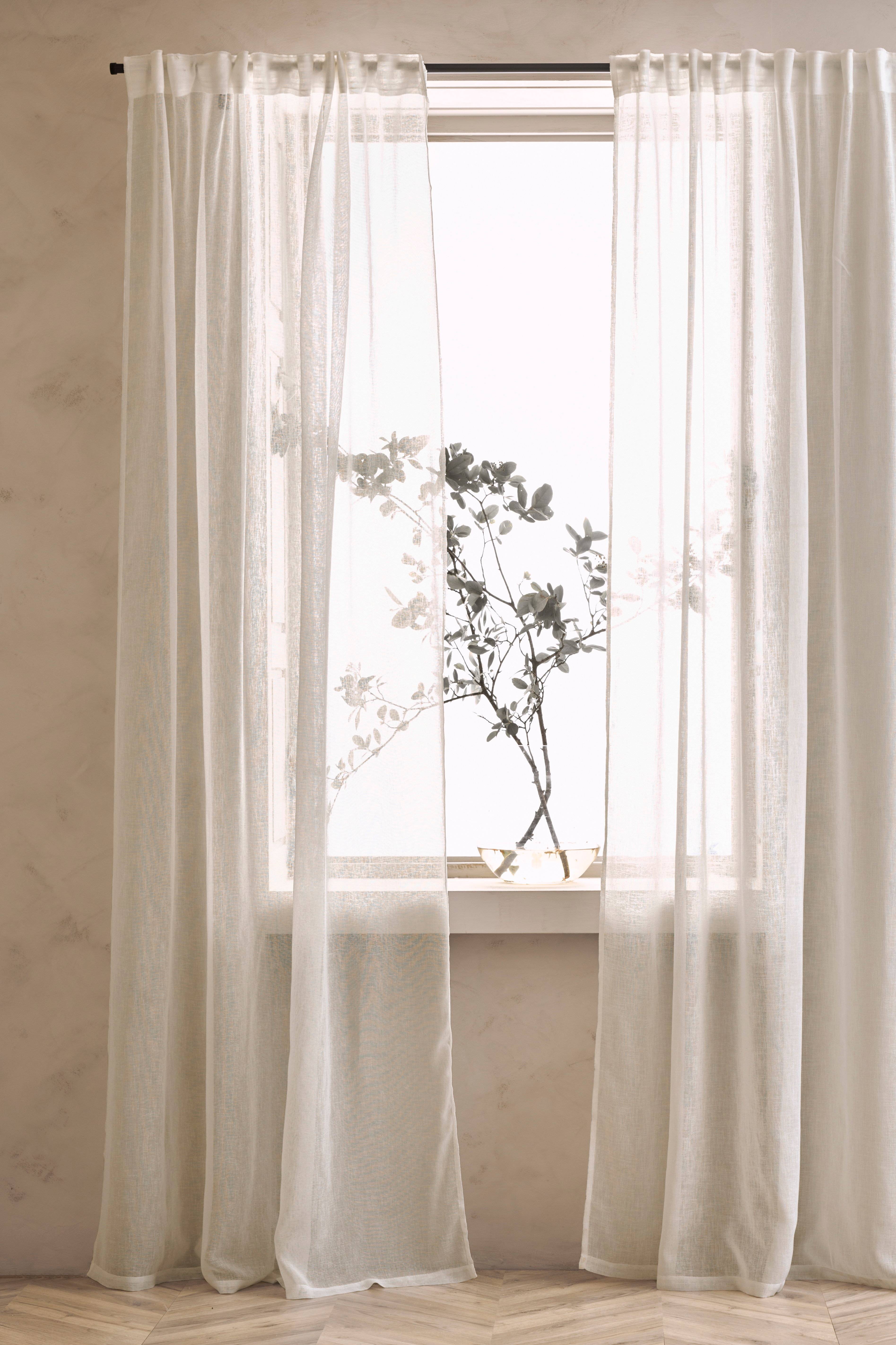 Två multibandslängder i glesvävd linnelook av mjuk, återvunnen polyester. Multibanden gör att du antingen kan hänga gardinerna direkt på en gardinstång genom de gömda hällorna eller använda ringar, nålkrokar eller fingerkrokar. Snören i rynkbandet gör att du lätt kan skapa jämna, fina veck.