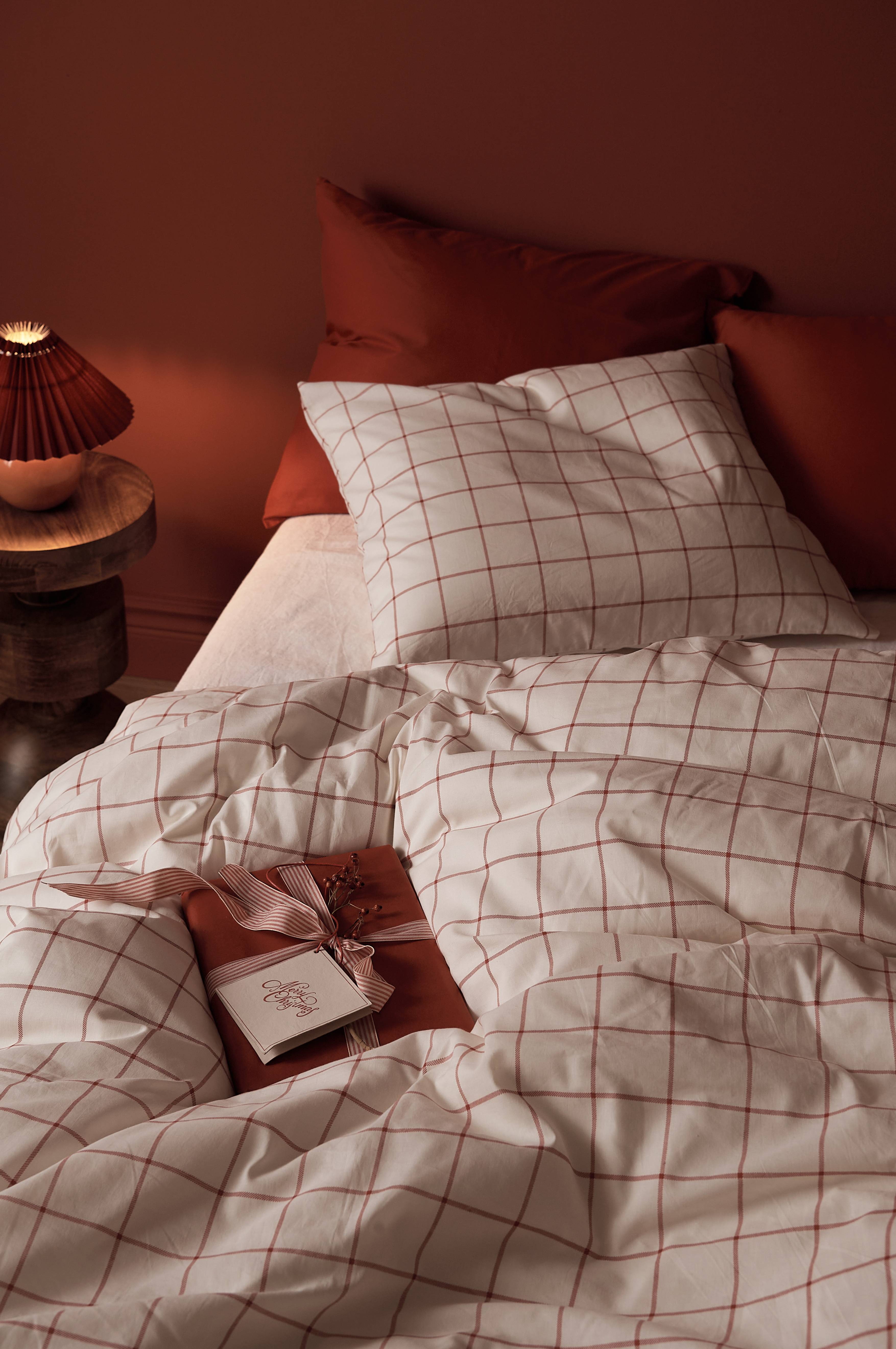 Påslakanset i bomull med tryckt rutmönster. Trådtäthet 144 TC. Påslakan med handhål. Tryckknappar i nederkanten. Setet levereras i en tygbag i samma kvalitet.