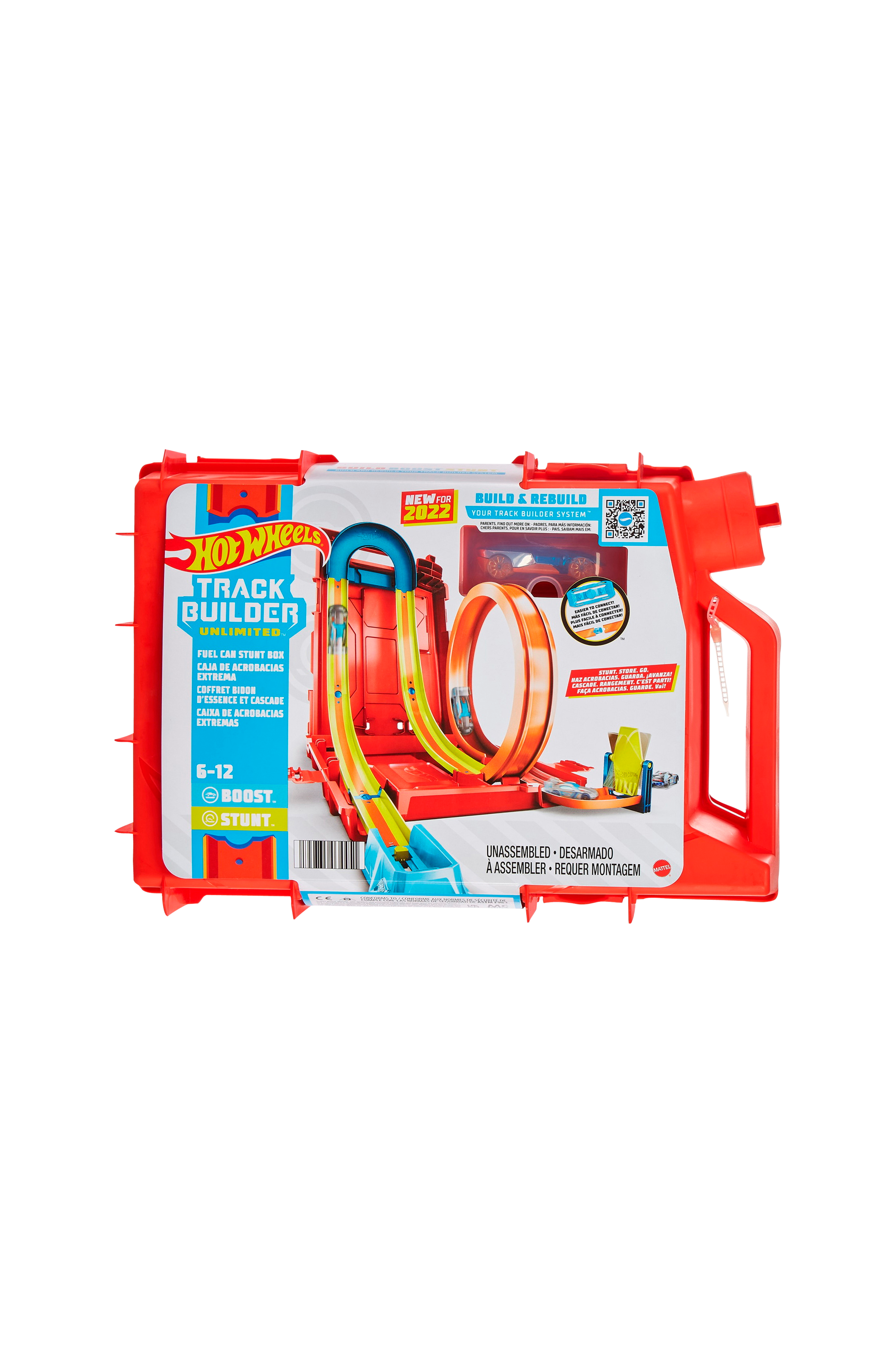Bilbana med böjda och raka delar där man skjuter iväg bilar som gör häftiga stunttrick.Fodralet som är i form av en bensindunk kan också förvandlas till en del av leksetet!Ett Hot Wheels®-fordon ingår.• Från 6 år.