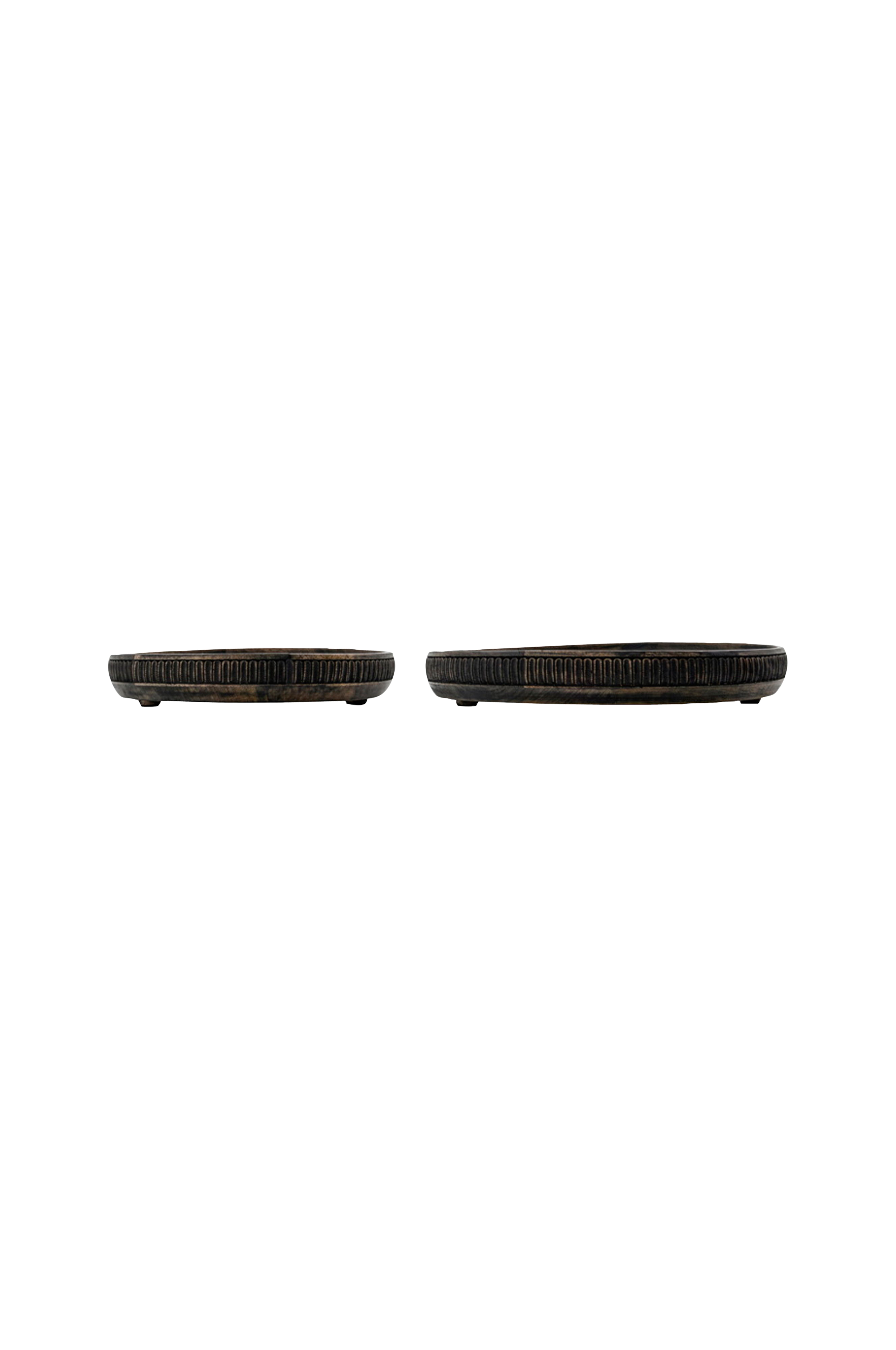 Dessa runda brickor i svartbetsat mangoträ är handgjorda och ger värme och rustik charm till din inredning. Använd denna uppsättning om två för att organisera föremål i hemmet, eller som en slående bas för ljus och vaser på ditt mat- eller soffbord. Den taktila ytan gör varje bricka unik och inbjuder till både vardagliga stunder och speciella sammankomster.