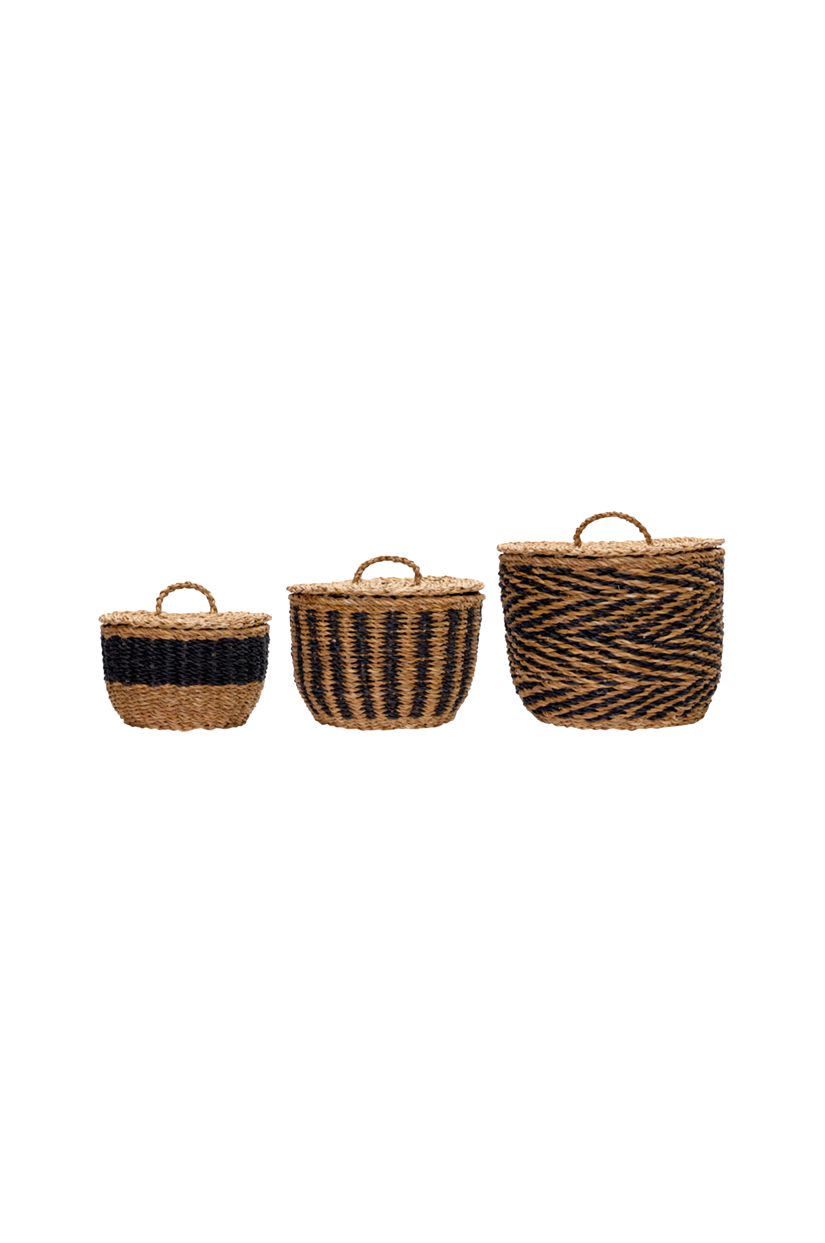 Ge ditt hem en naturlig prägel med denna uppsättning av tre handgjorda korgar av sjögräs, alla med lock och slående svarta mönster. De är perfekta för förvaring av allt från minnessaker till hantverk och kombinerar iögonfallande grafik och bohemisk charm för en mångsidig stil. Lyft stämningen i vilket rum som helst genom att ställa ut dem tillsammans eller separat.