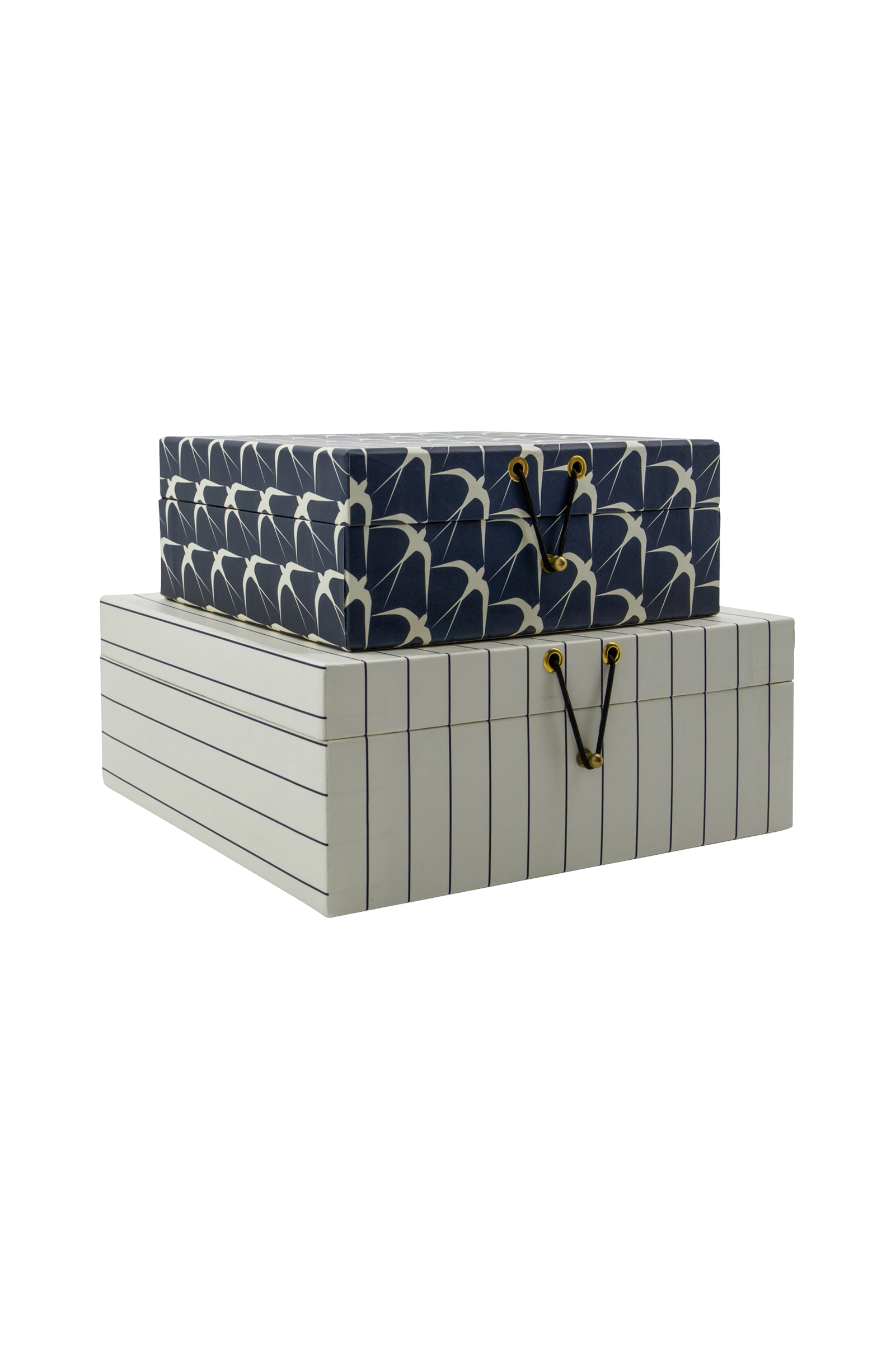 Set med två förvaringsboxar med kontrasterande mörkgrått tryck och sandfärgad, randig design. Perfekt för att organisera brevpapper, dokument eller småsaker.