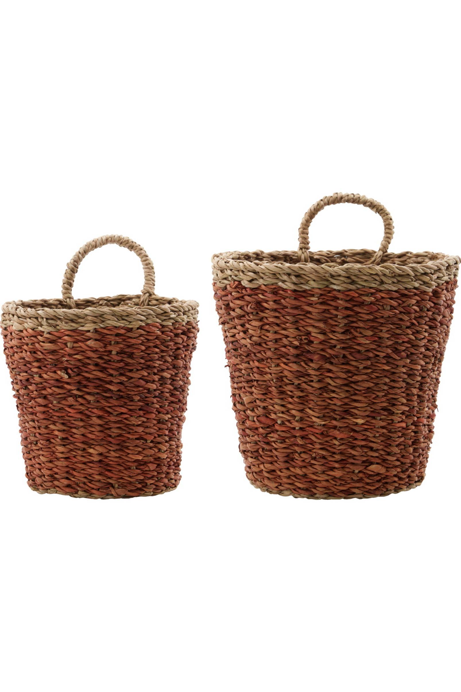 Denna uppsättning av hdhere tvåfärgade korgar är handvävda av sjögräs i en rik brun nyans. Deras varma, taktila design ger praktisk förvaring för små föremål eller växter.