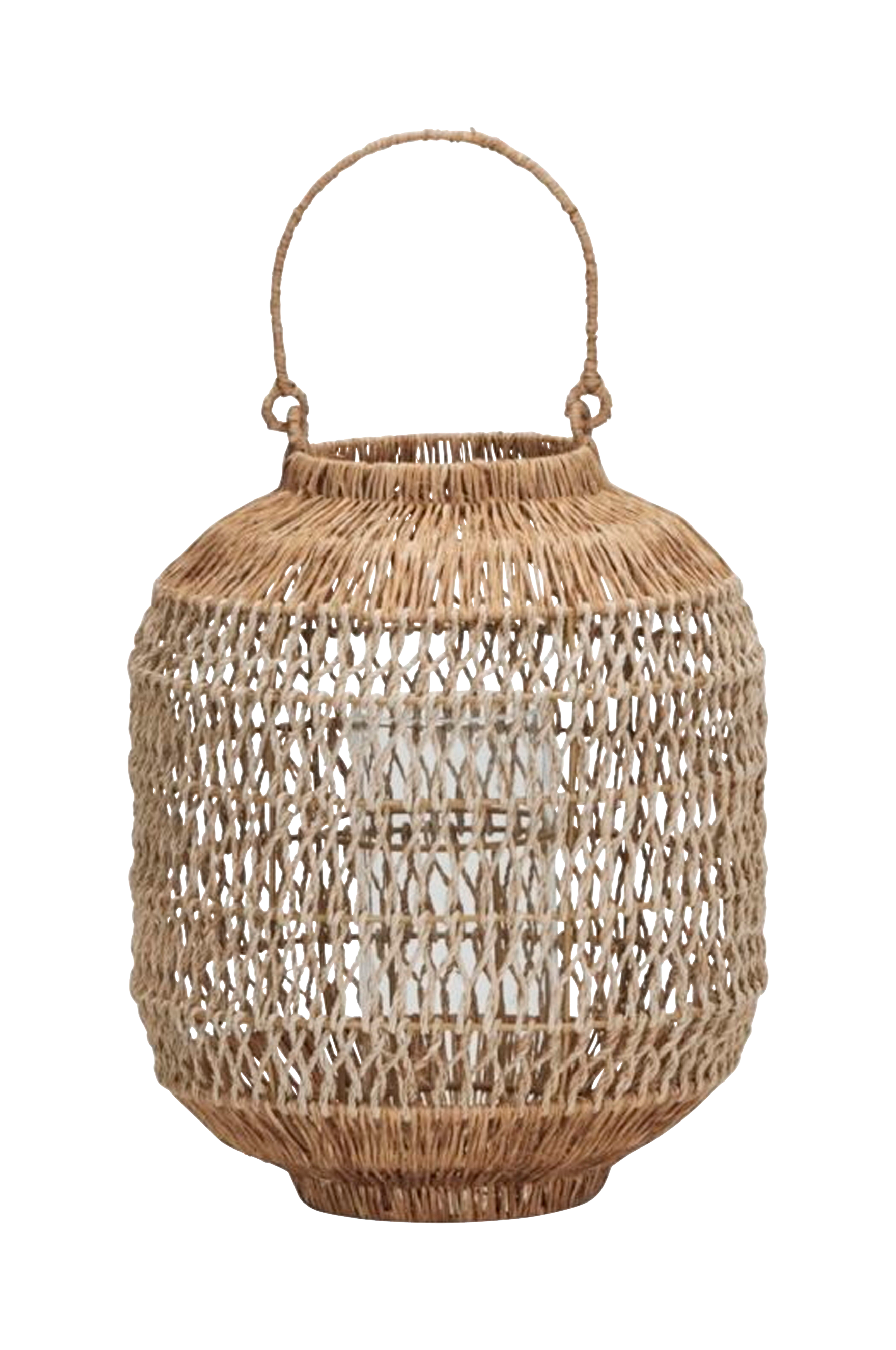 Förhöj din inredning med den här handgjorda jute-lyktan som kombinerar funktion och hantverksmässig skönhet på ett perfekt sätt. Den är lämplig för både inomhus- och utomhusbruk och ger ett varmt, inbjudande sken genom sin glasinsats, vilket berikar alla miljöer. Lägg till en touch av värme och elegans i ditt utrymme med denna utsökta lykta. Material: 60% jute, 40% järn, 100% glas (insida).