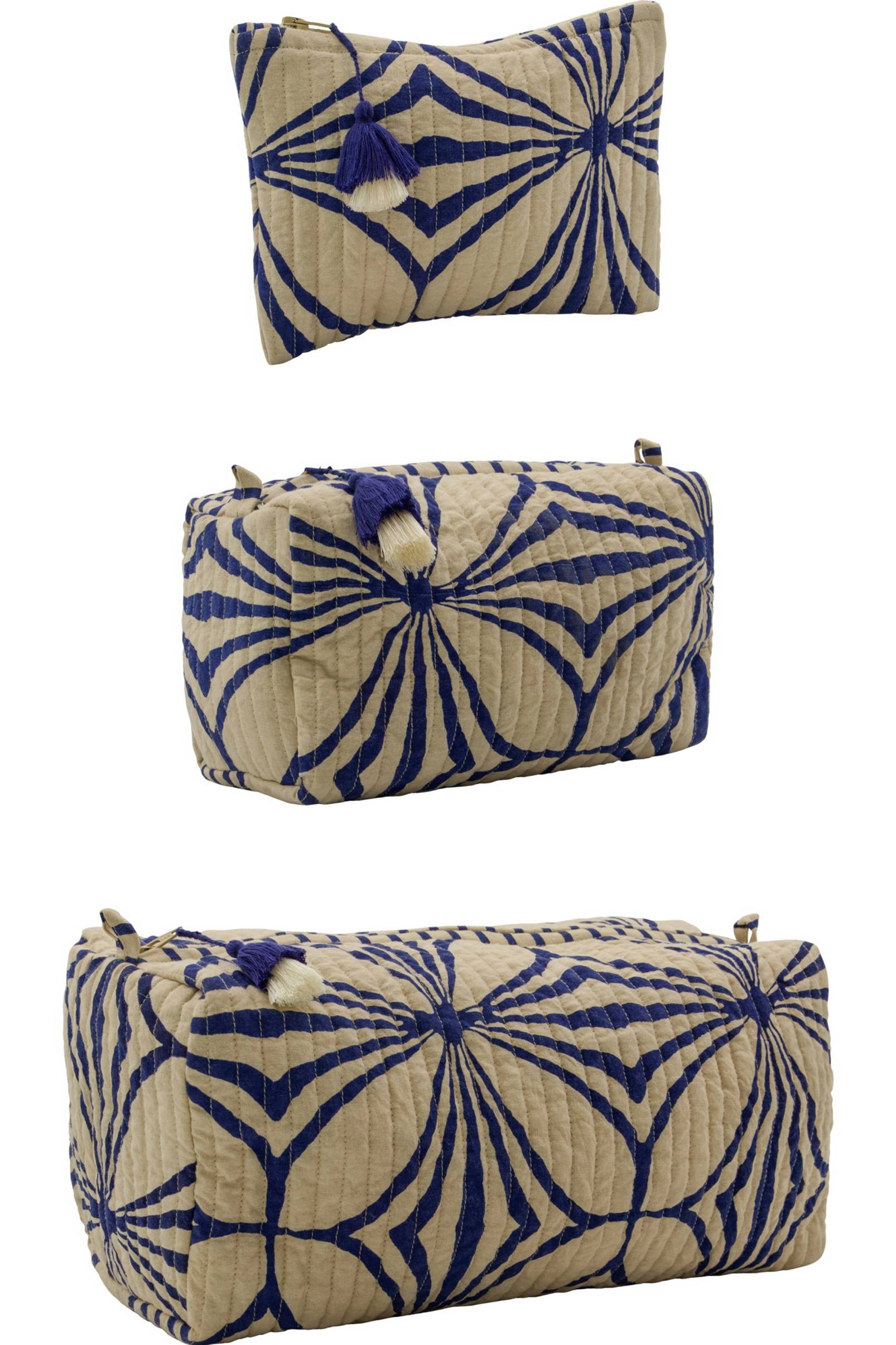 Håll ordning på dina viktigaste saker med hdcare necessärset. Setet innehåller 3 storlekar för att passa dina behov, var och en med ett djärvt blått mönster på benvit bomull. Väskorna har en tofs med dragkedja och är perfekta för förvaring av badrumsartiklar hemma eller för att packa snyggt på resan.
