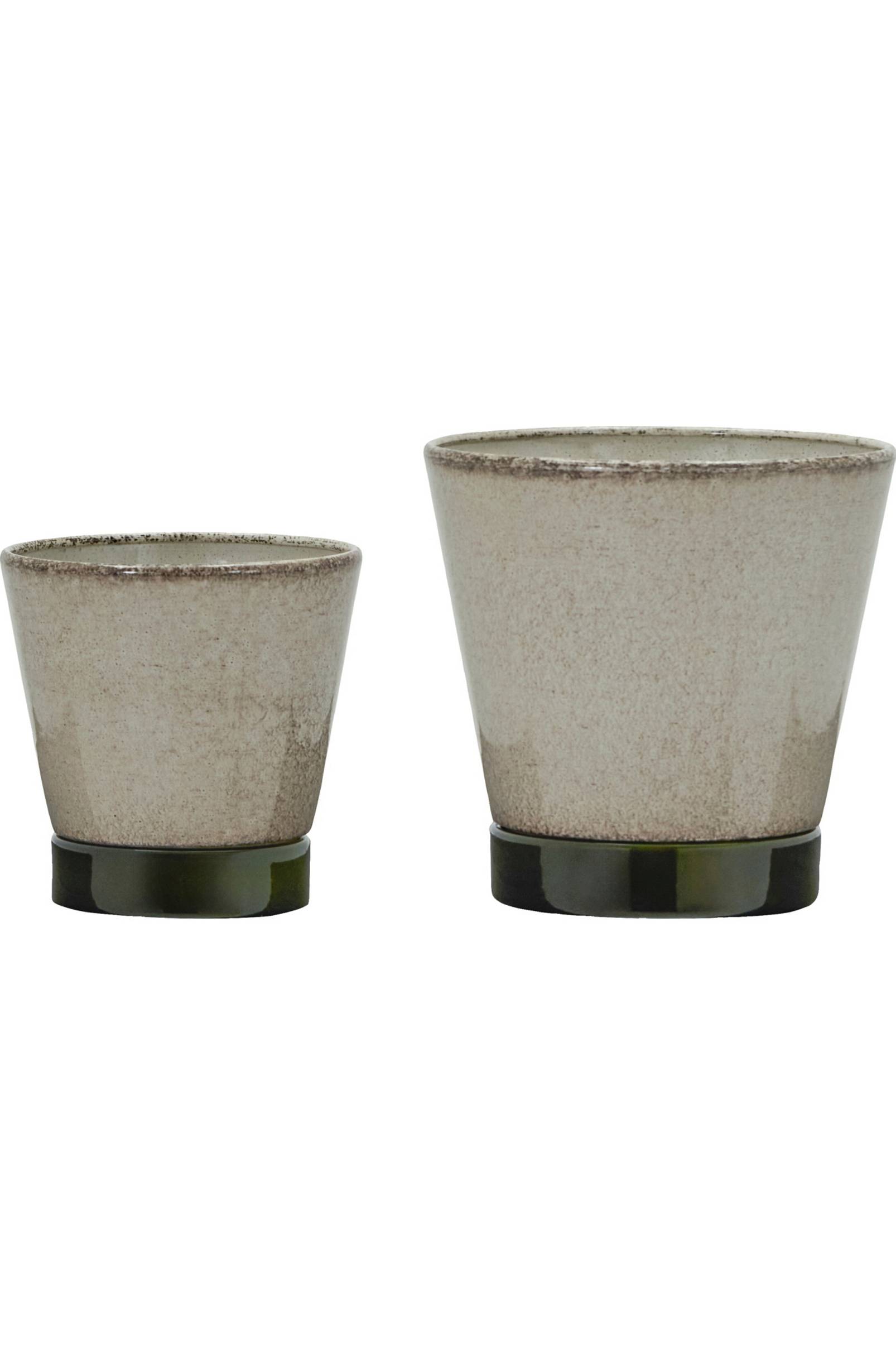 Hdlima är en uppsättning av två keramiska planteringskärl med en spräcklig beige yta och blanka gröna fat.