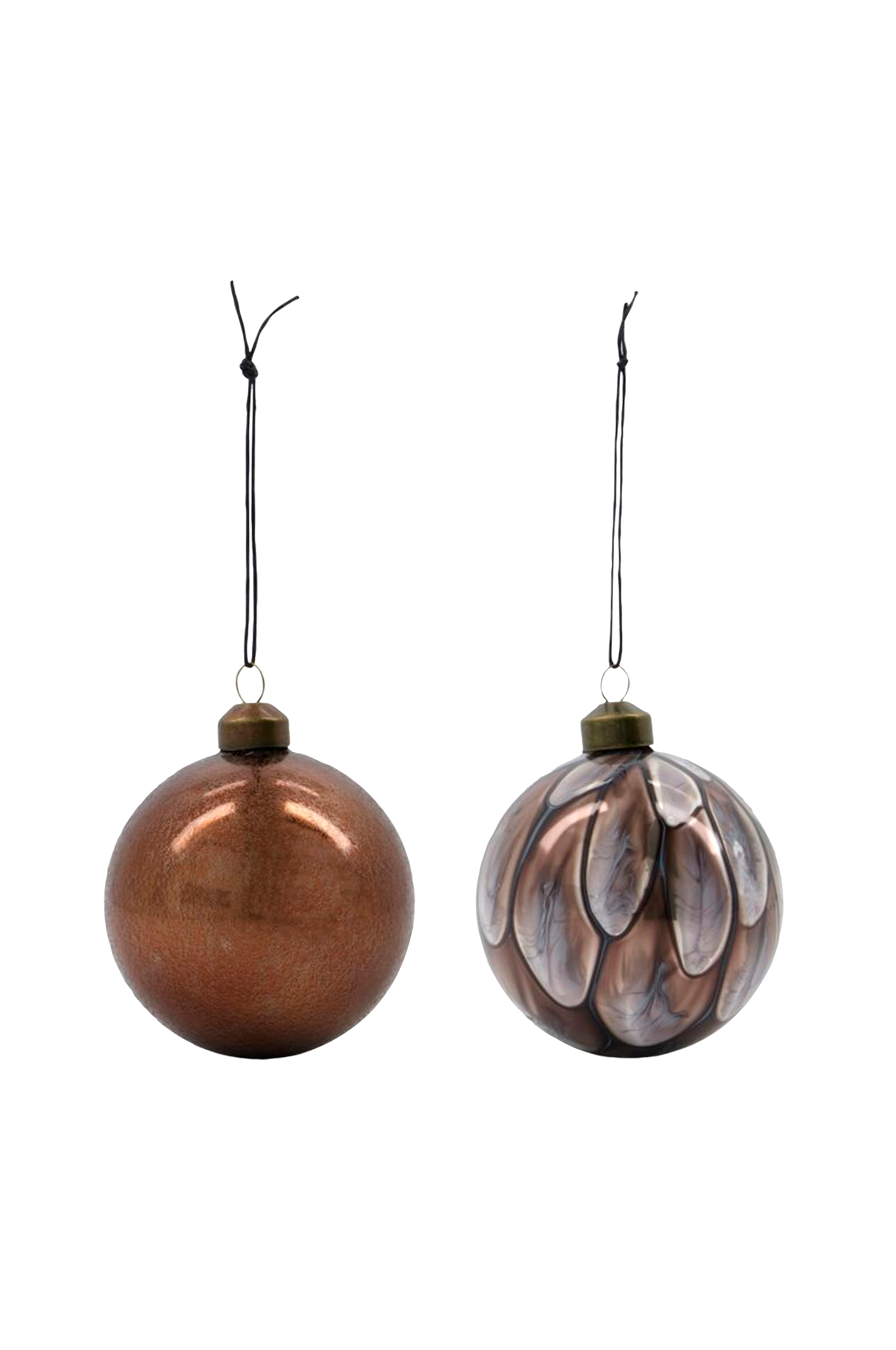 Med två olika mönster ger denna uppsättning med två glasprydnader från House Doctor elegans till din julgran. Julgranskulorna Runy har fått en klassisk färg och har matta metallkåpor som ger en hint av vintage. Matcha med vilken färg du vill. För en cool, nedtonad look kan du kombinera med vitt och silver. För att lägga till en gnutta elegans och värme kan du matcha med guld. Med Runy får du klassisk elegans, inte bara till din julgran utan även till en dekorativ bricka eller en gren som hänger i taket. Material: Glas, Metall, Polyester. Finish och färg kan variera.