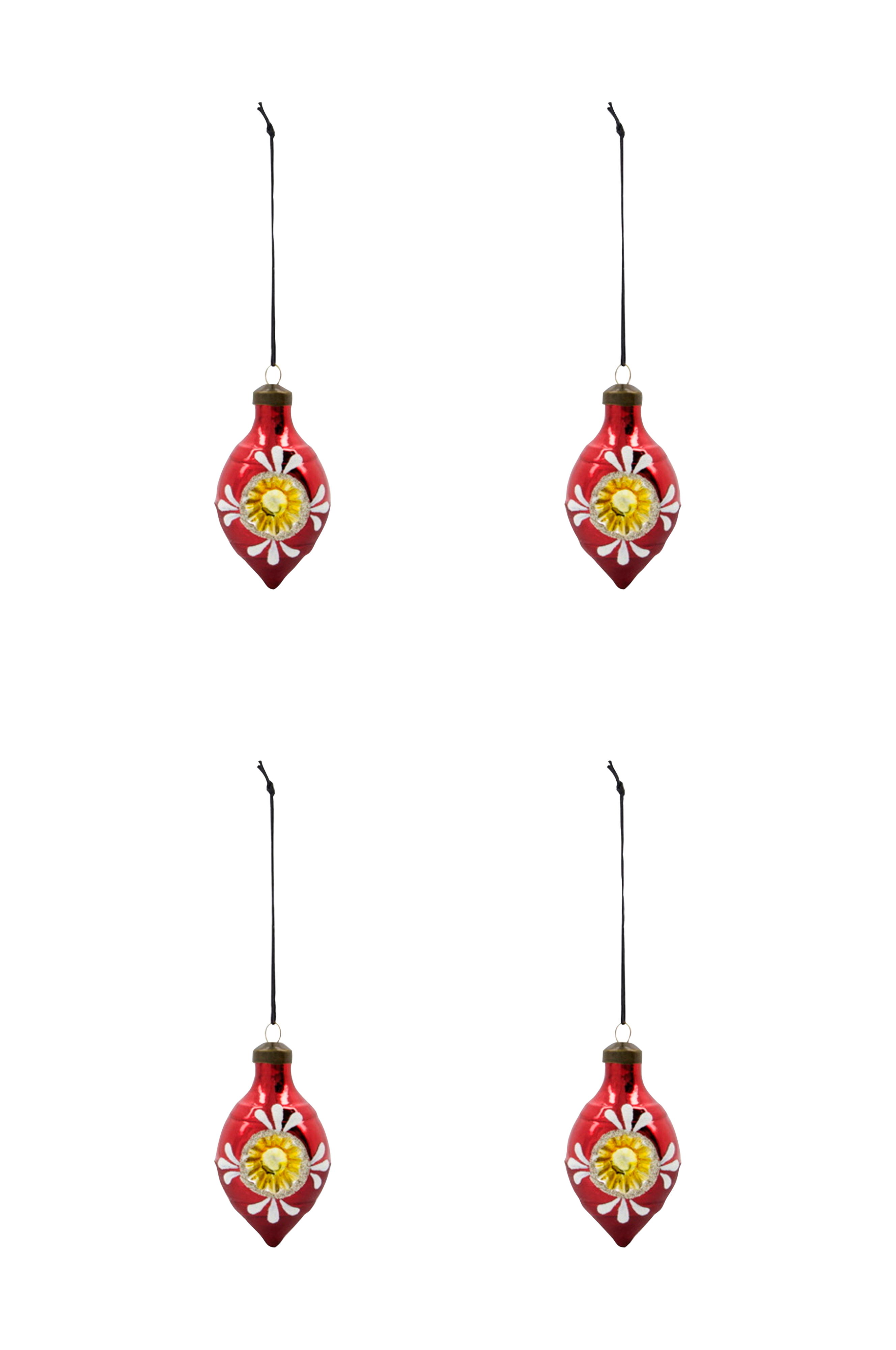 Förhöj din festliga inredning med dessa nostalgiska munblåsta glasprydnader. Den droppformade designen, prydd med ett handmålat mönster, utstrålar tidlös elegans. En guldfärgad fördjupning med en silverglittrande kant förstärker vintageintrycket. Denna uppsättning med fyra ornament ger en sofistikerad charm till alla juldekorationer.