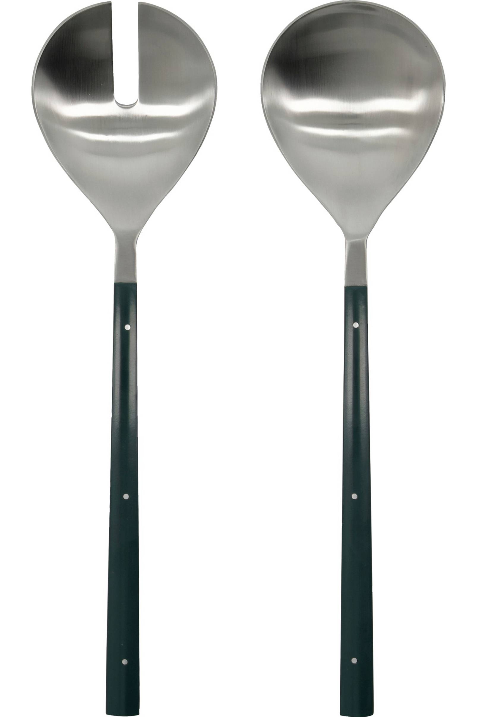 Set med två salladsbestick i borstat rostfritt stål med mörkgröna handtag i polyresin. De kontrasterande materialen skapar en ren och raffinerad look.