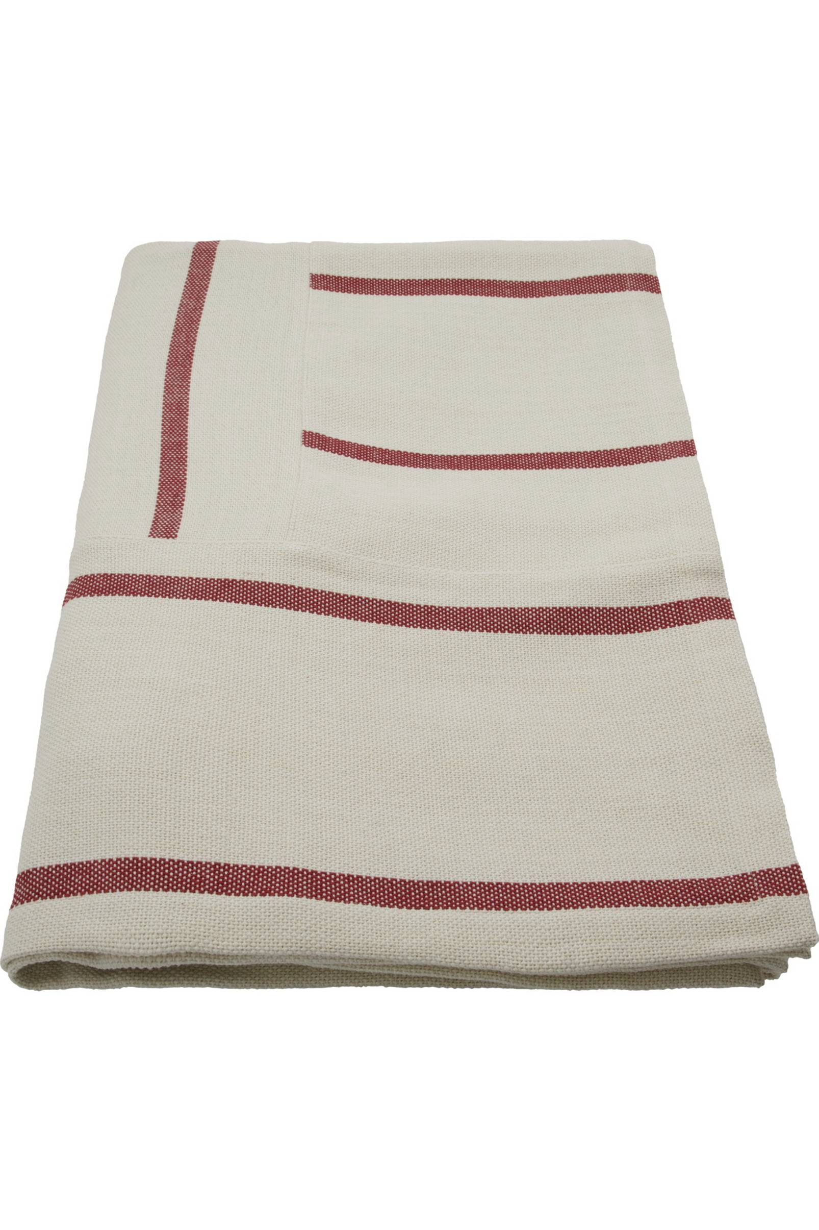 Denna sängkappa i bomull har ett mörkrött mönster som vävts in i en benvit bakgrund. Den texturerade väven ger ett taktilt och geometriskt inslag i sängen eller soffan.