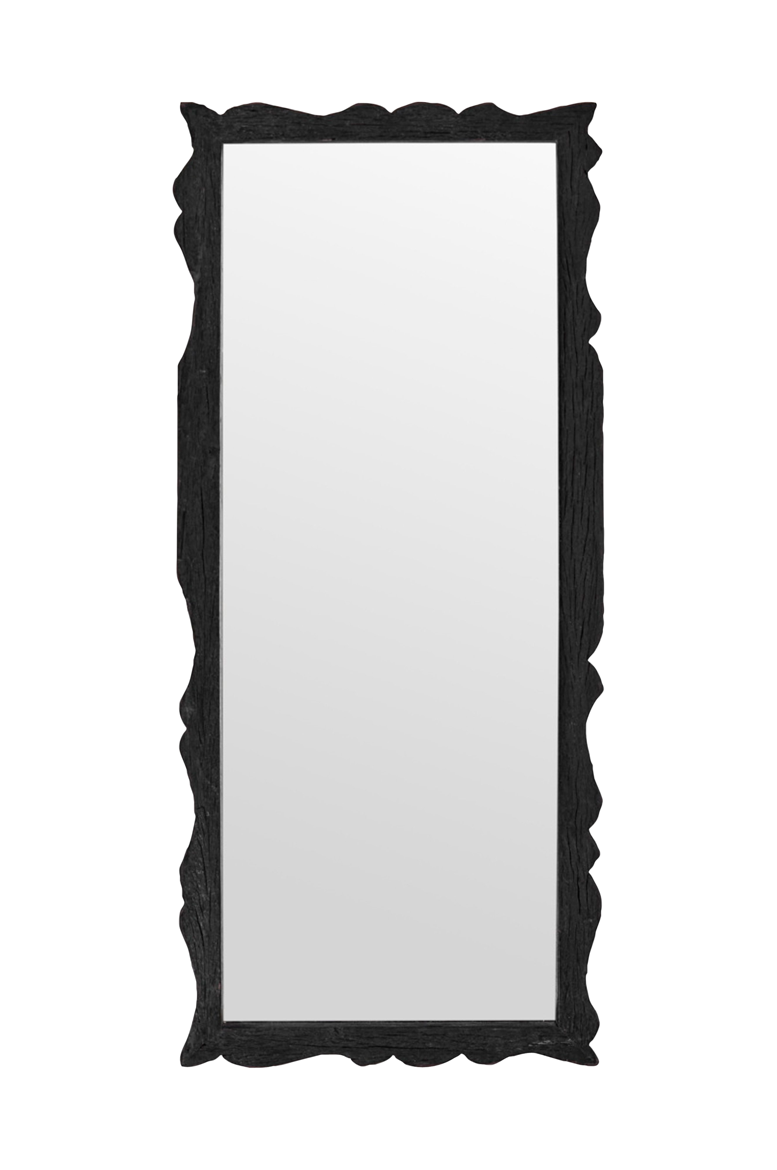 Denna handgjorda spegel ger en distinkt touch till din interiör, med en vackert snidad, vågig ram i trä. Den rika bruna ytan ger värme, medan varje ram avslöjar sin egen unika karaktär.
