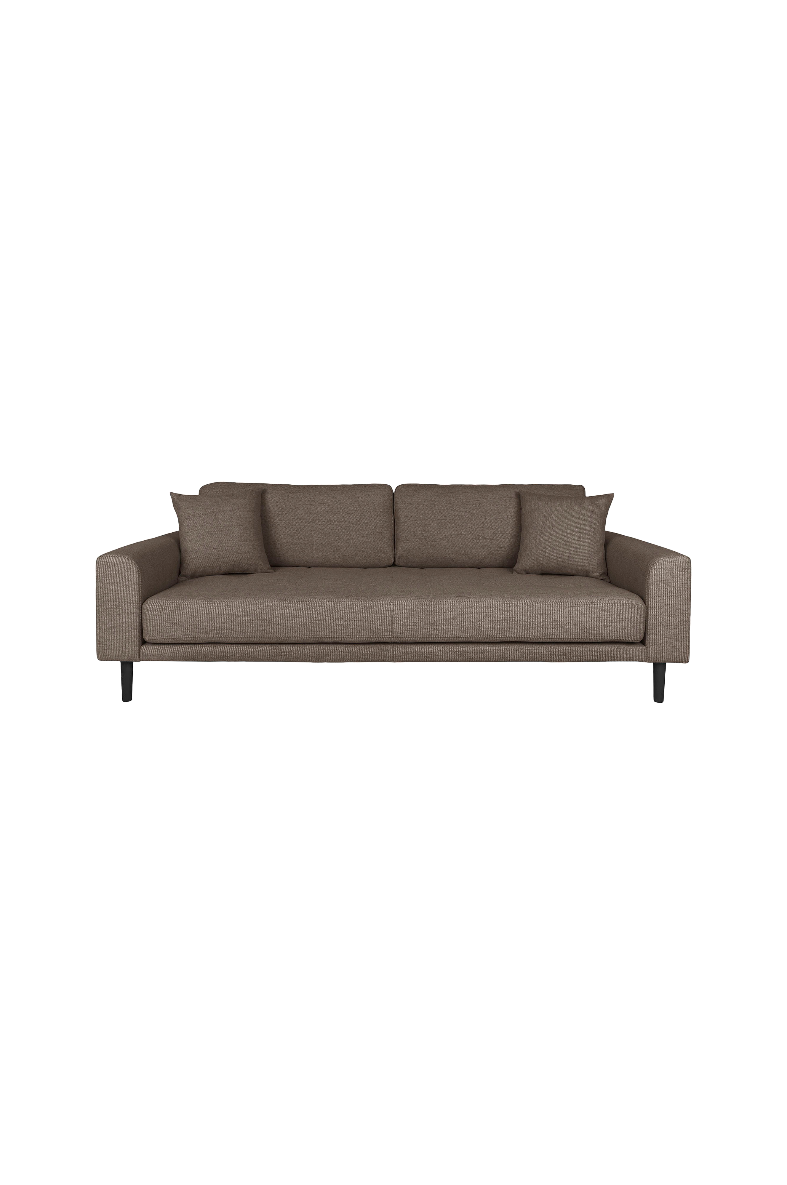 3-sitssoffa med två kuddar och ben av trä i naturfärg