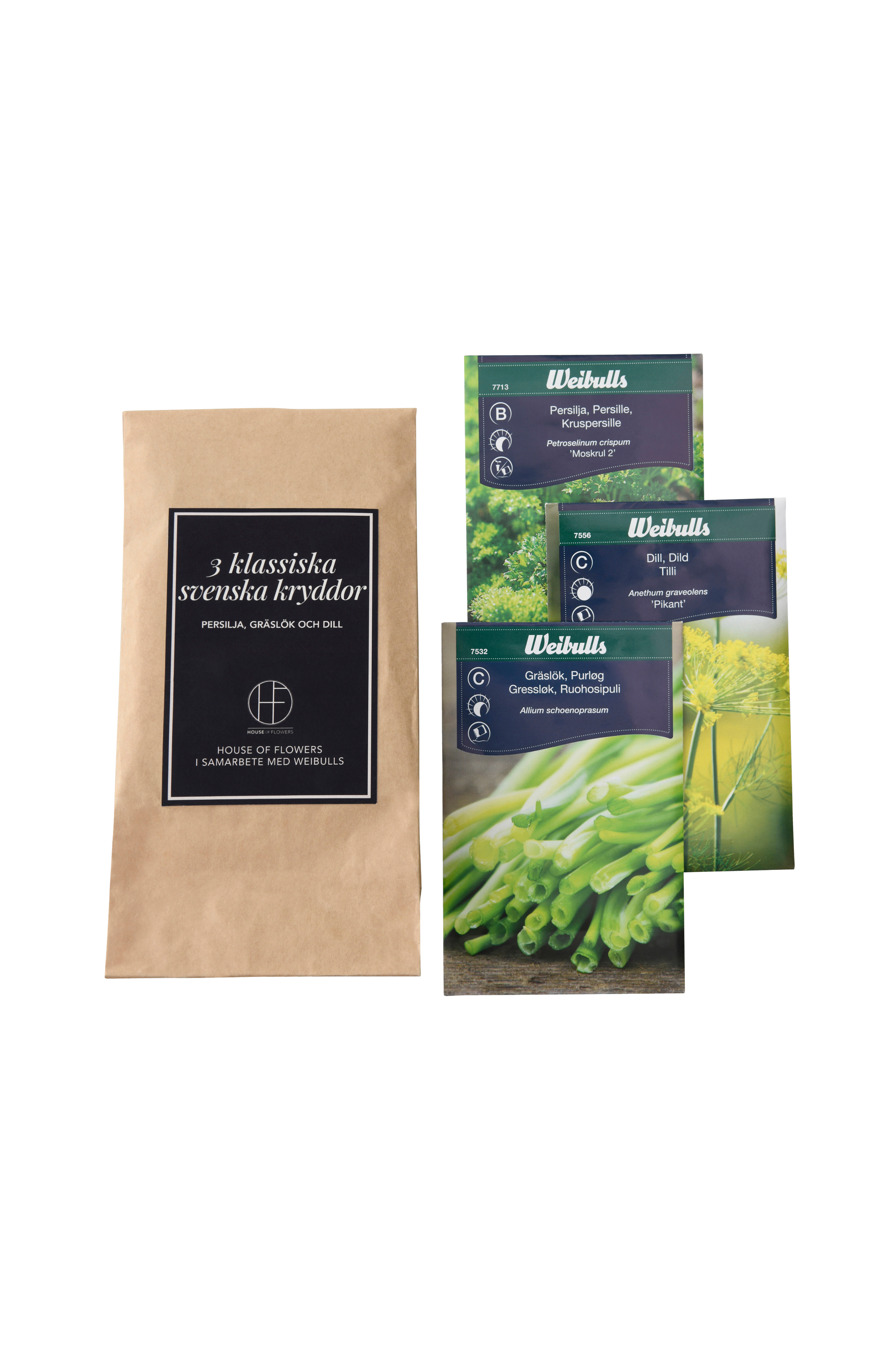 Fröpaket med tre klassiska kryddor: persilja, gräslök och dill.