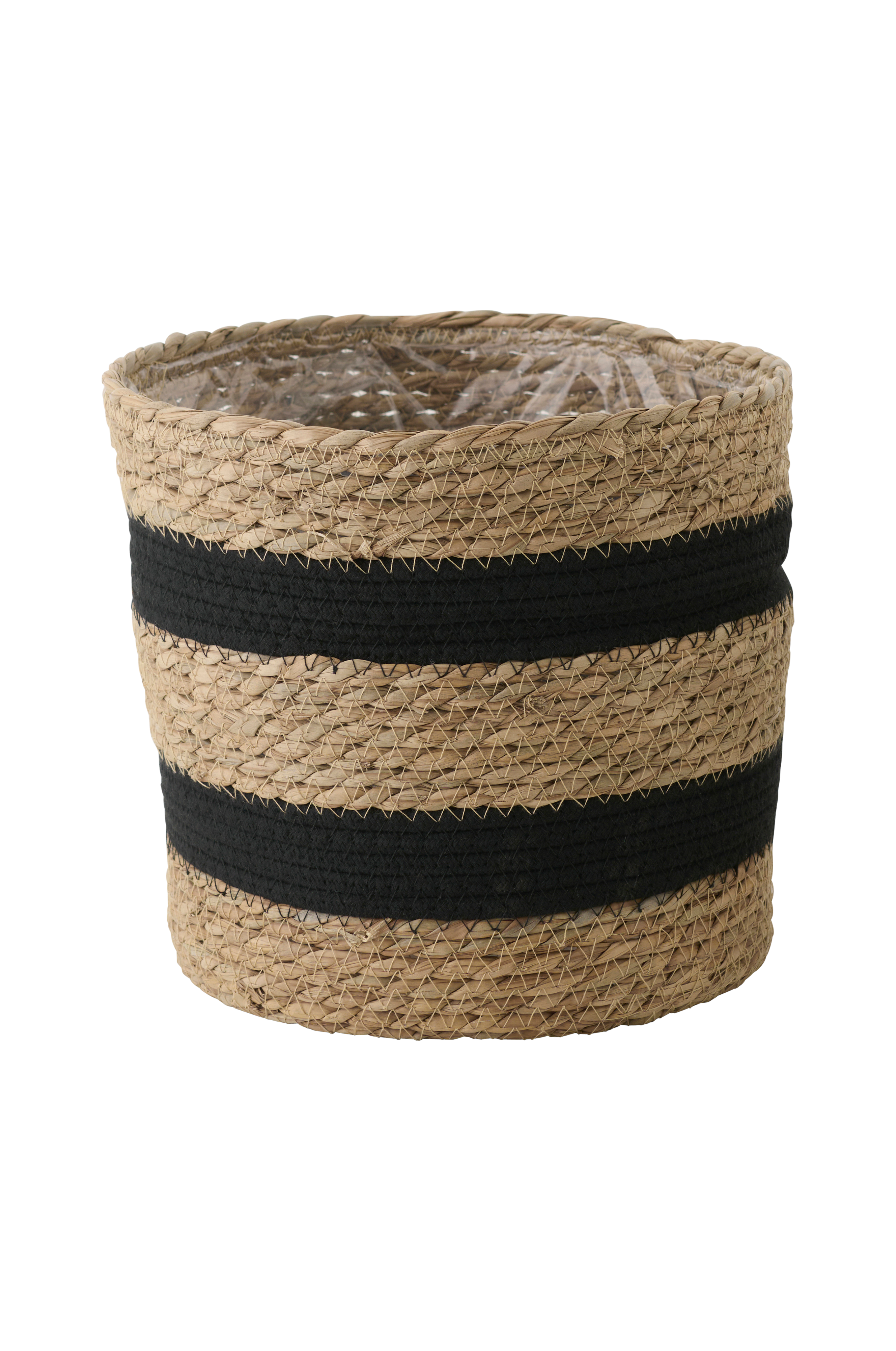 Stilrena krukor i flätad korg. Perfekt för växter då dom är plastförseglade invändigt. Höjd 26 cm. Diameter 28 cm