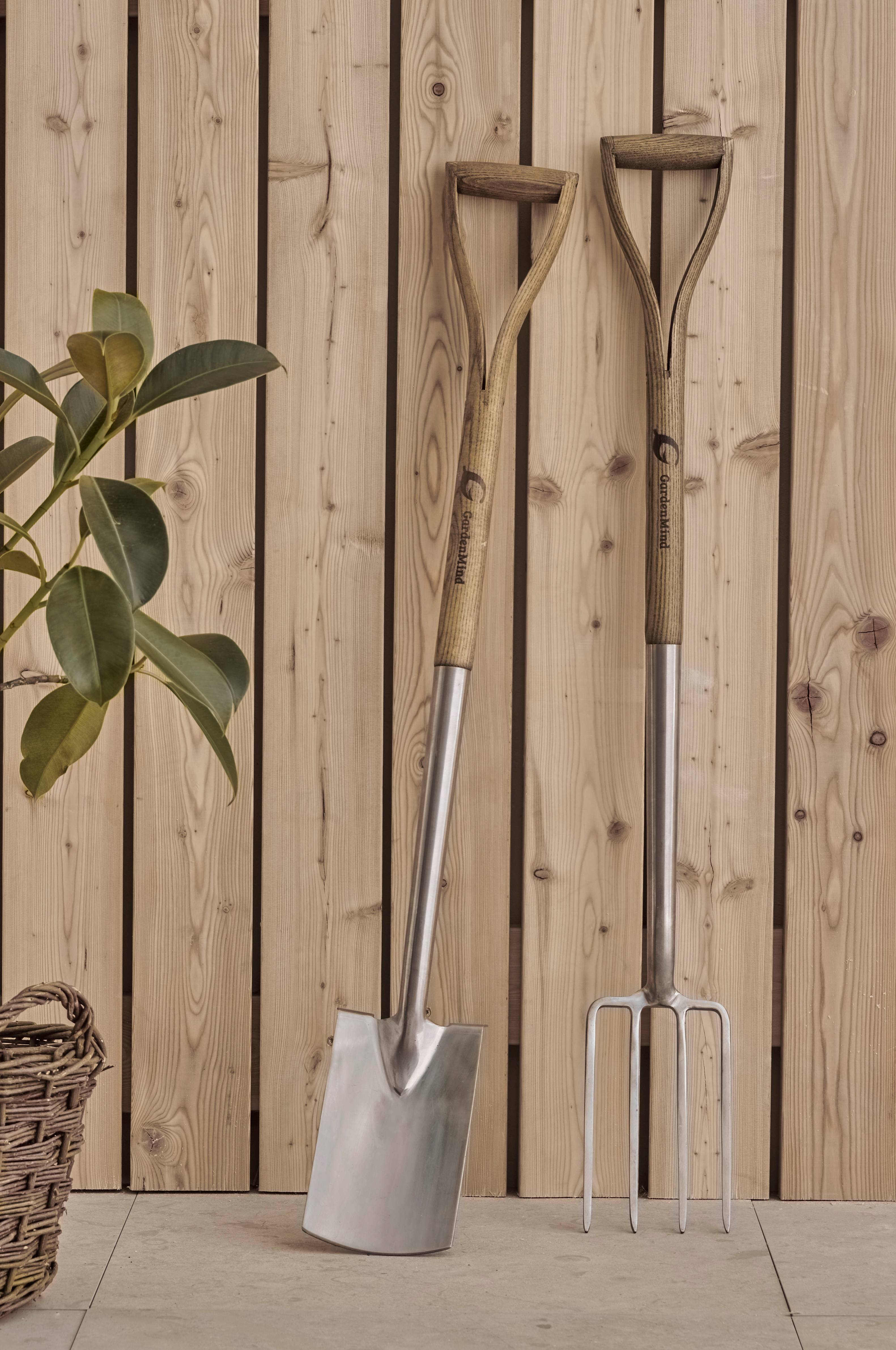 Rejäl spade i nättare modell av rostfritt stål. Handtag i mörkbetsat trä.
