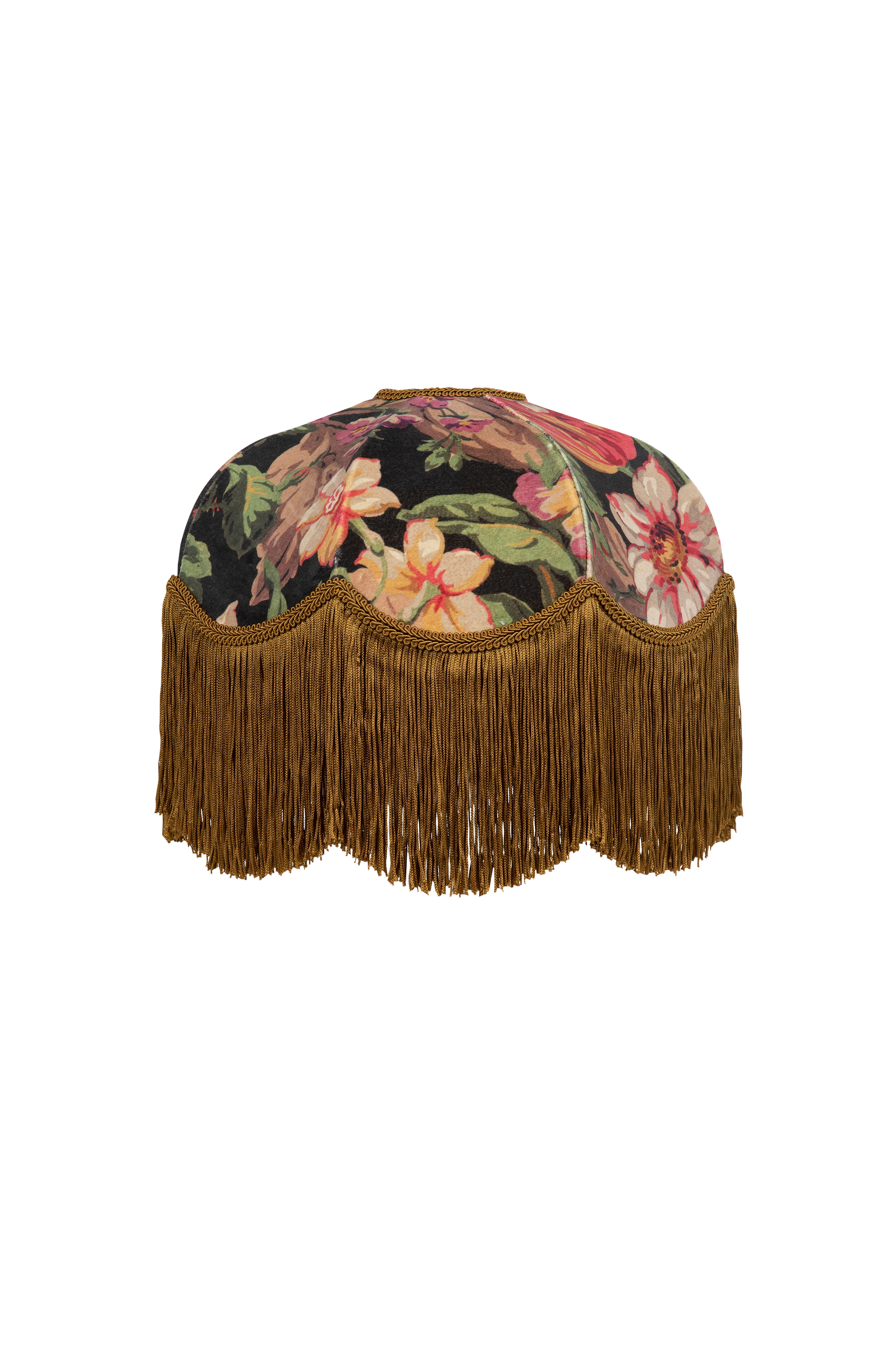 Mörk och imponerande, lyxig lampskärm av sammet med svart blommönster, handgjord i Storbritannien i traditionell, viktoriansk stil. Diam 42 cm, höjd 16 cm + 15 cm fransar. Upptill diam 10 cm