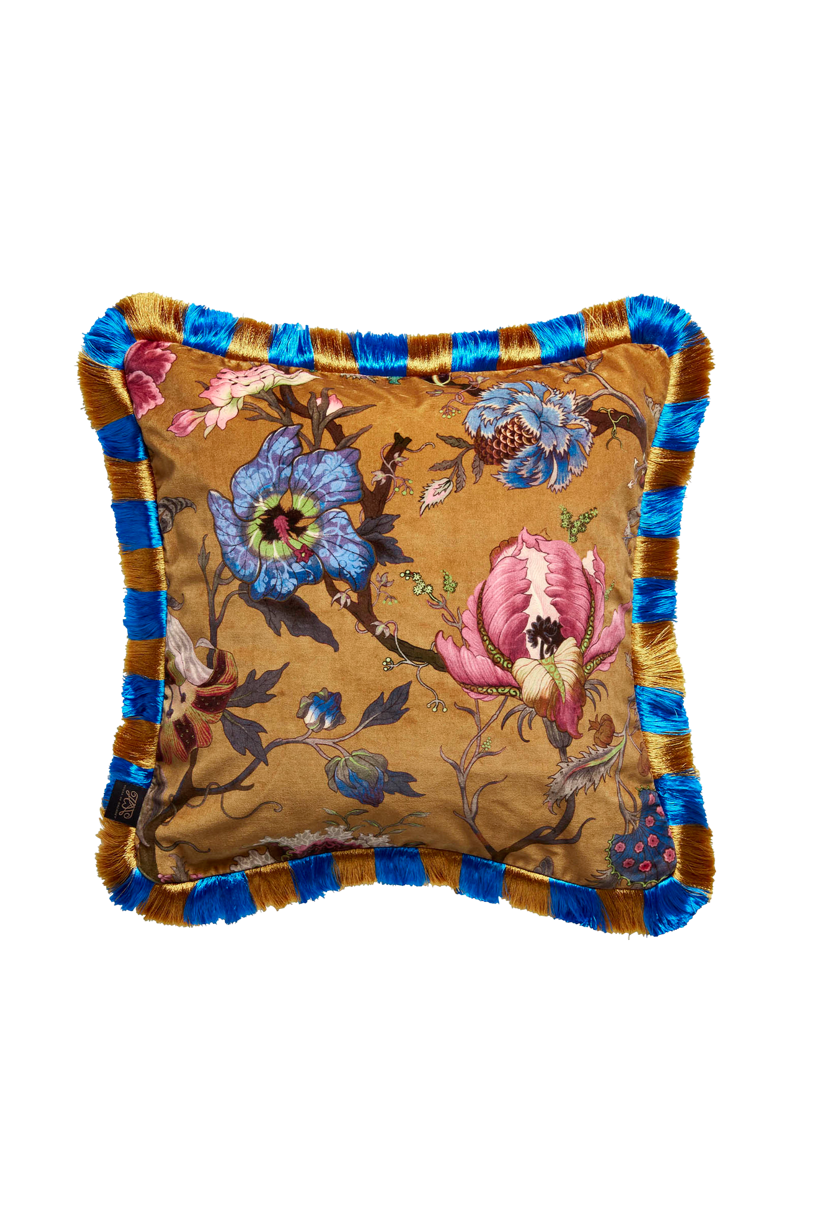 Drottningen av omtolkningar, vårt älskade mönster ARTEMIS, har omarbetats än en gång i rika bronsfärger med rosa och blå blommor. Inspirerad av vår hjälte, den firade 1800-talsdesignern William Morris (vars alster, liksom våra, ofta var stiliserade avbildningar av den vilda, brittiska naturen), dekorerar det ikoniska mönstret denna lyxiga sammetskudde. Tillverkad i Storbritannien med djärva, randiga fransar i bronsfärg och topasblått. 100% bomullssammet