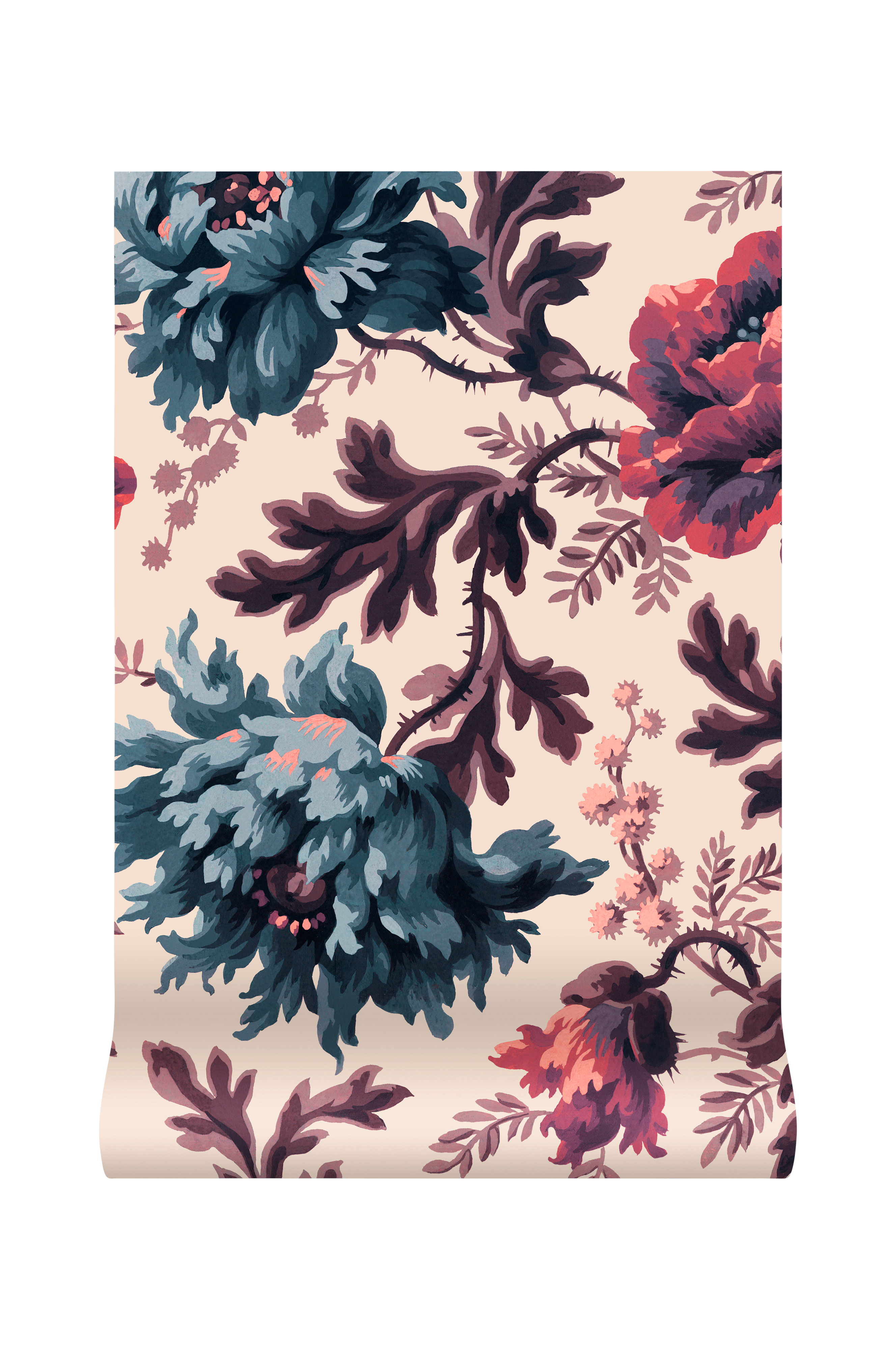 Tapet Opia omarbetas på ett konstfullt sätt i Opia Magna. Opaia Magna är ommålad i magenta och har vårt älskade vallmotryck, förstorat i storlek och inramat av sagoliknande bladverk, vilket skapar en överdimensionerad effekt. Vackert bohemiska accenter av magenta och reussiskt blått tillför ditt hem enastående färg.